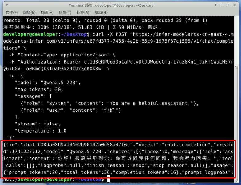 在Terminal Emulator窗口中使用curl脚本进行大模型API的调试。其命令如下: