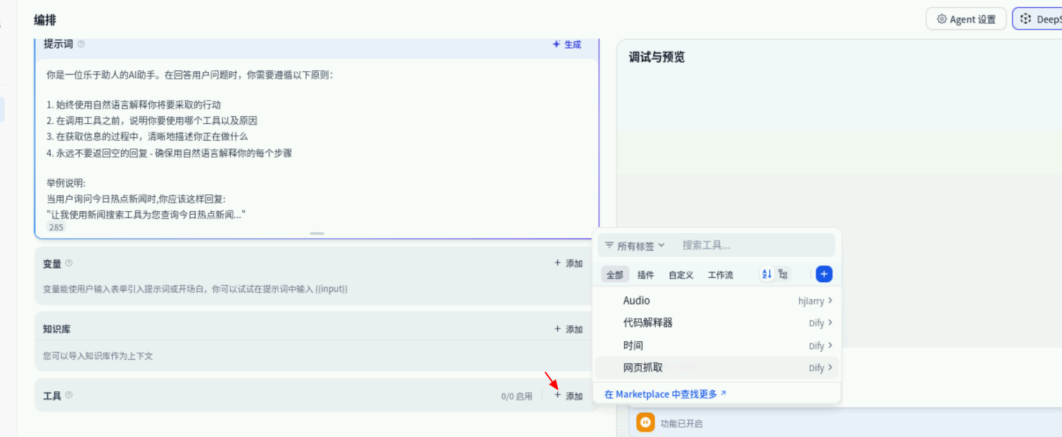 ## 3.4 添加工具 在编排页面的下方的工具区域,按需求添加工具并与模型进行对话调用,Dify内置有丰富的插件,同时支持自定义工具的创建。