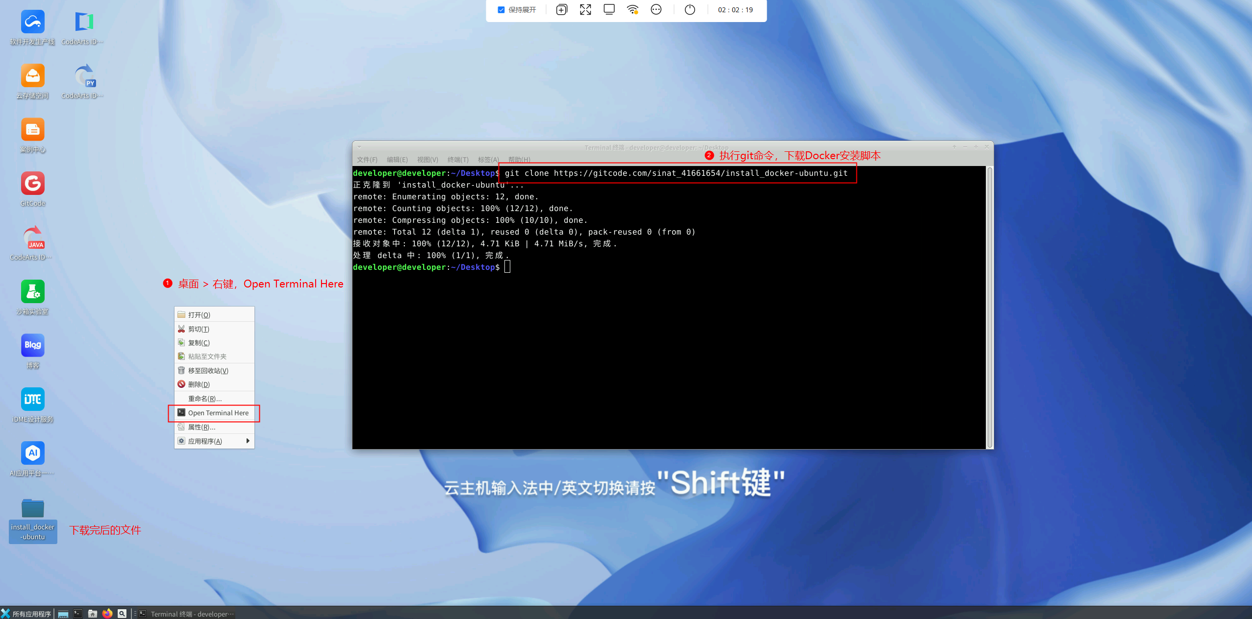 在华为开发者空间-云主机桌面右键,选Open Termimal Here,打开命令行窗口。执行如下命令,下载Docker自动化安装脚本。。