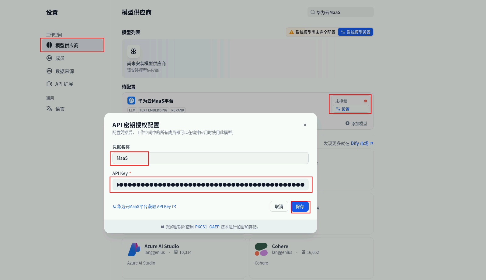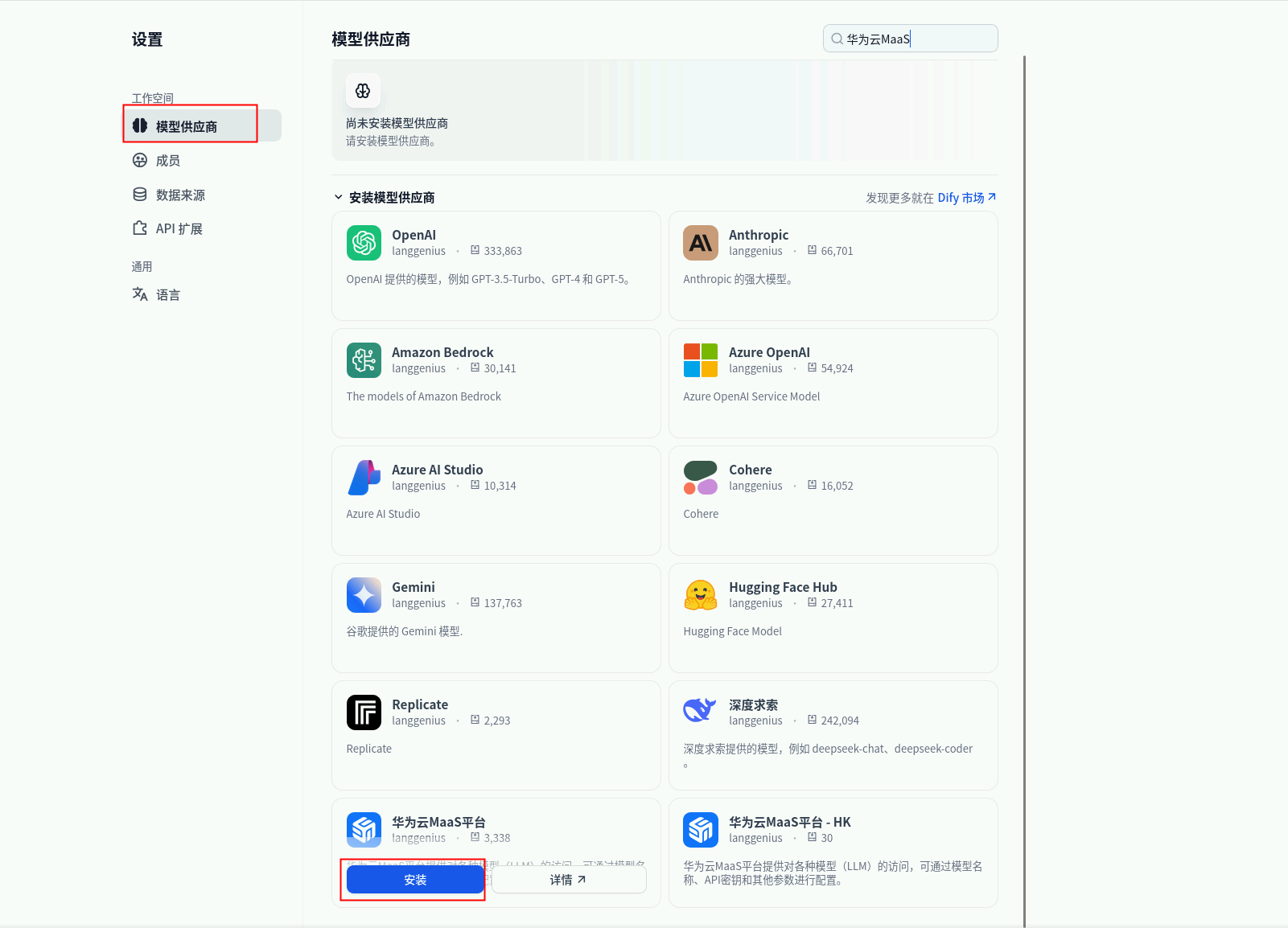 在Dify工作室页面,点用户头像图标,选择设置,进入设置页面。在设置页面左侧选择模型供应商,右侧搜索并找到华为云MaaS平台,点击安装
