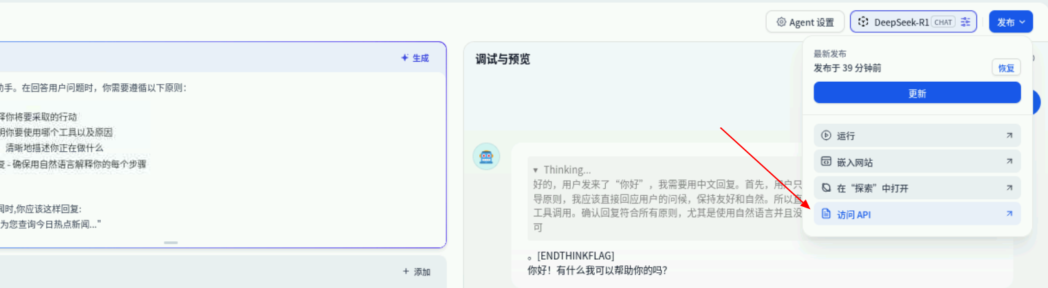 我们可以使用页面与Agent进行交流,也可以通过API的方式与Agent进行沟通。