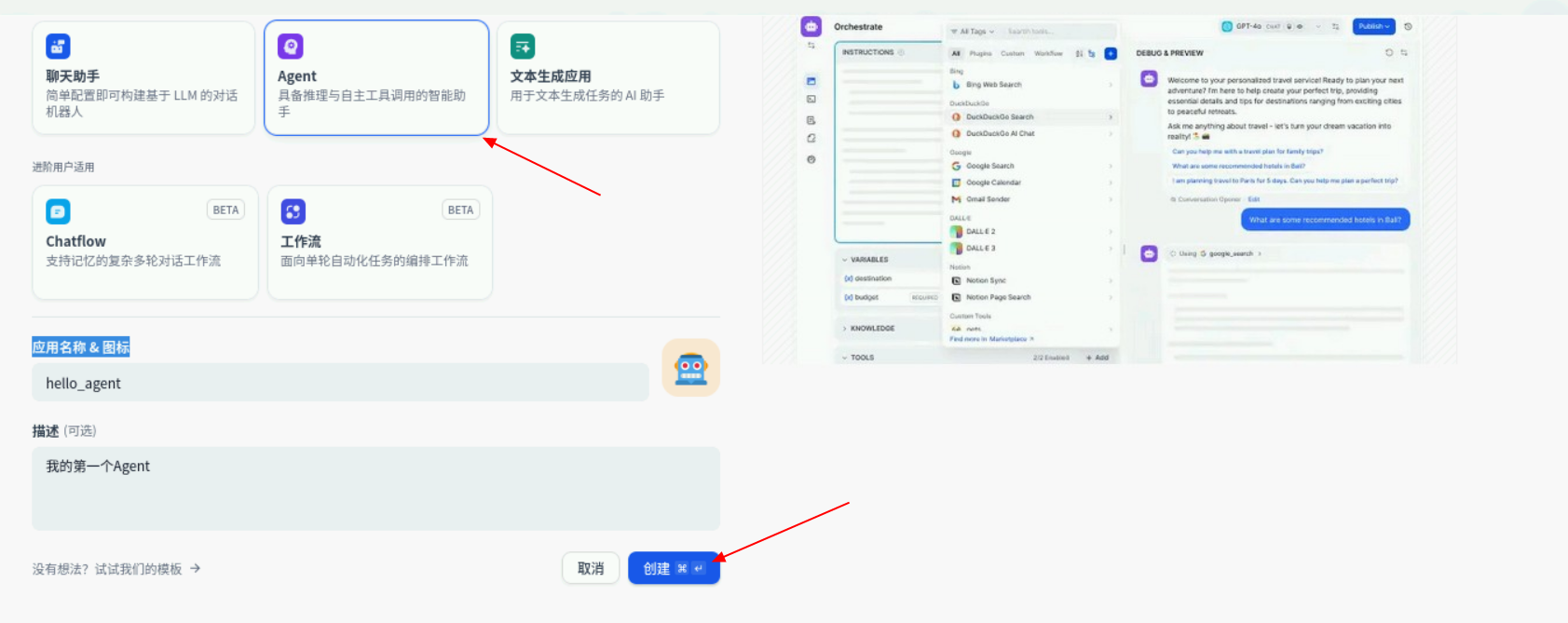 进入创建空白应用页签后,点击Agent,输入应用名称 & 图标以及描述后点击创建。