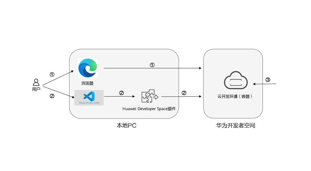 - PC本地通过VS Code安装Huawei Developer Space插件,远程连接云开发环境(容器);