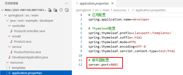 打开src/main/resources/下的application.properties文件,为防止本地服务端口号冲突,这里修改为8085,如下图所示: