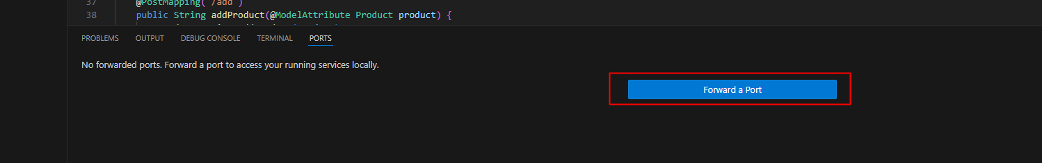 首先我们需要在本地转接一下,才能通过浏览器访问,在PORTS下点击【Forward a Port】新增转接端口,设置之前设置的8085端口如下图所示: