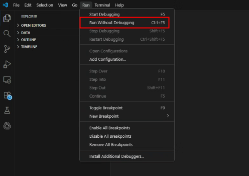 找到启动类,点击【Run】按钮,选择【Run without Debugging】进行启动。