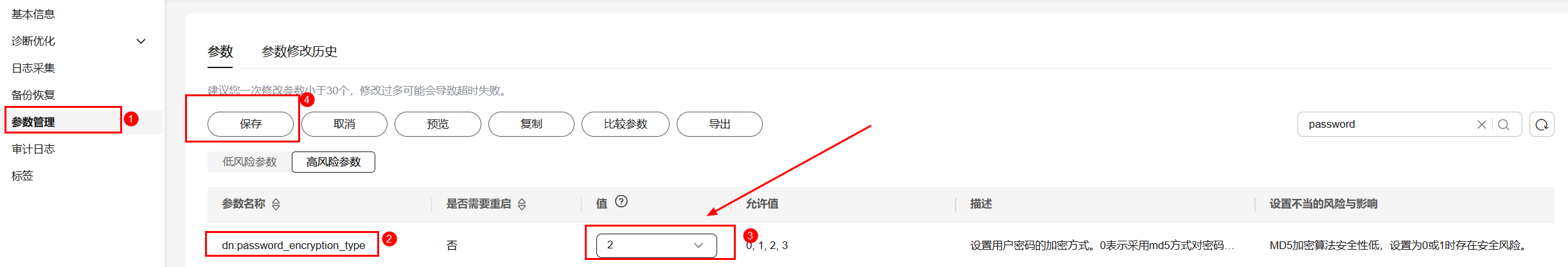 进入GaussDB数据库控制台,进入GaussDB实例,点击参数管理,修改GaussDB的密码验证参数 password_encryptio_type 为 1。并点击保存生效。