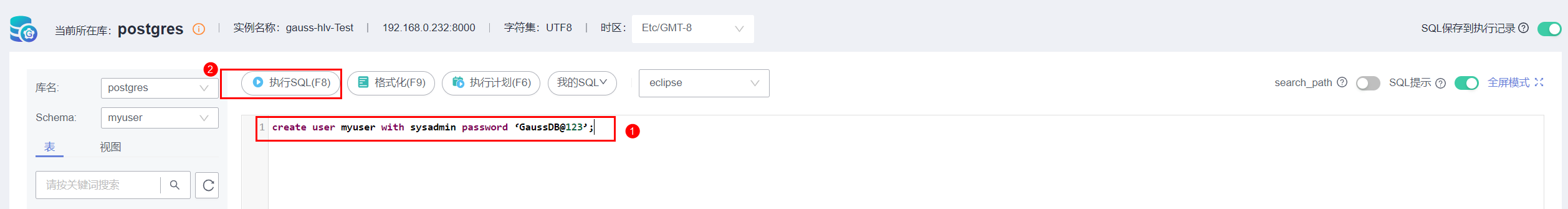 通过右上角登录GaussDB的SQL操作界面,用如下SQL创建Django链接的登录用户。