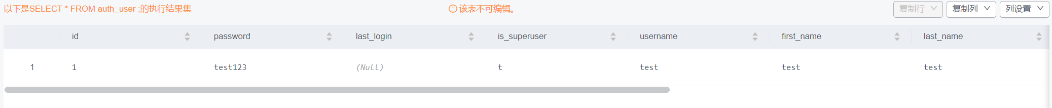 但此时用户密码是明文存放在数据库中的,不符合django规范,还不能使用该用户登录admin管理后台。