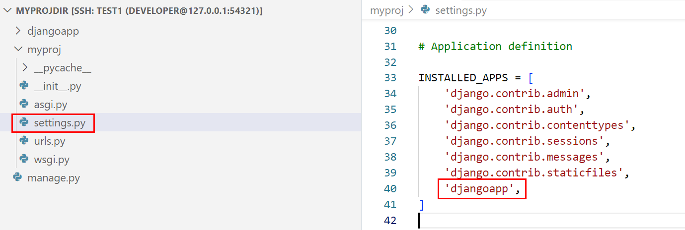 vim ~/myprojdir/myproj/settings.py