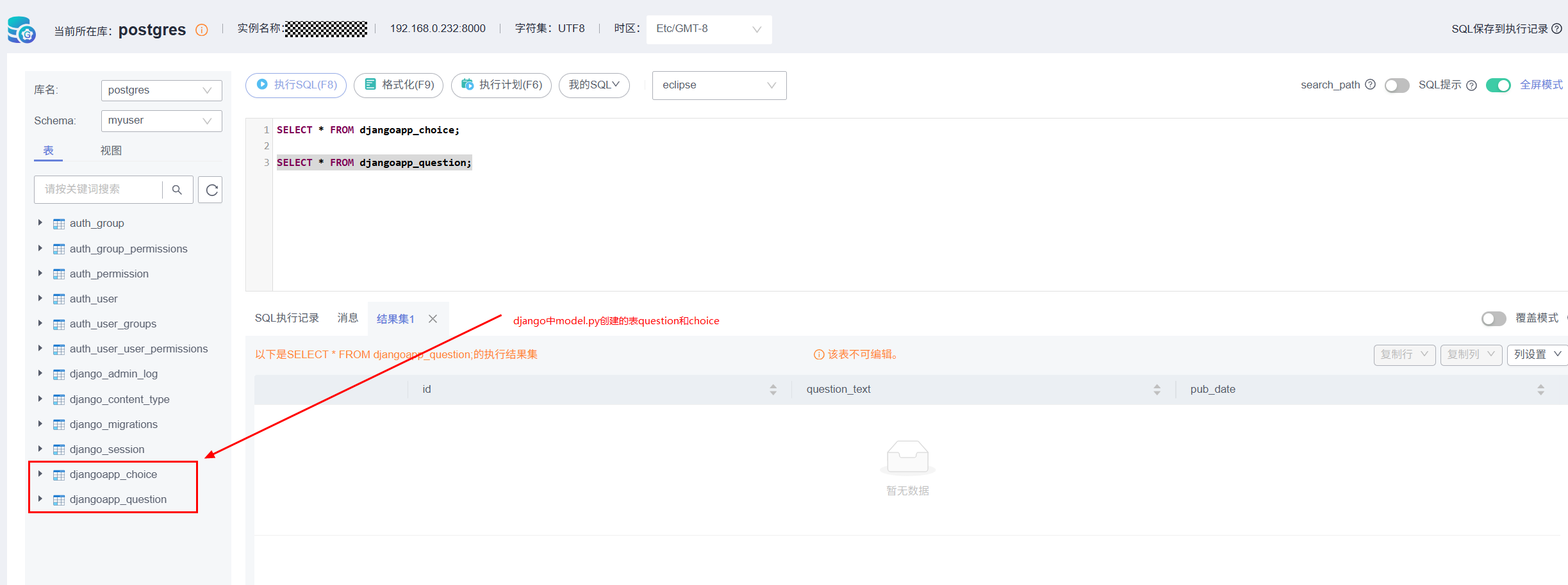 待迁移完成后,GaussDB数据库可看到Question和Choice两张表: