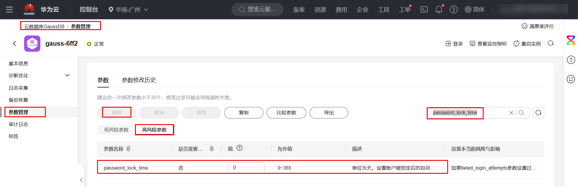 重置密码后,回到数据库参数管理界面,点击高风险参数,输入password_lock_time搜索,将password_lock_time的值改为0并保存。