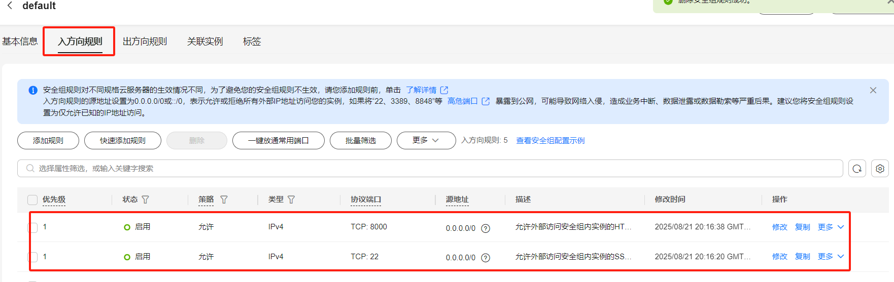在GaussDB数据库实例的基础信息页修改安全组,开放22端口与8000端口: