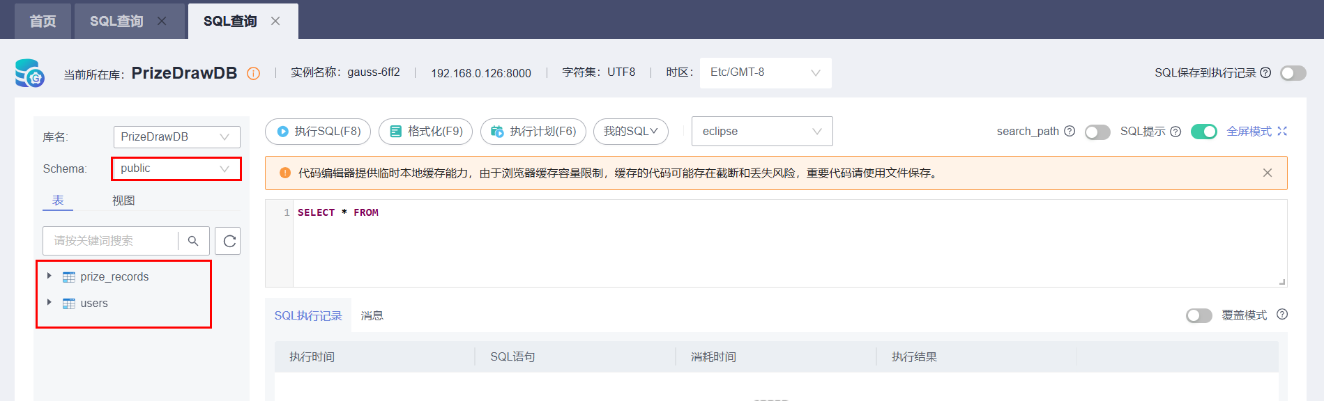 代码运行成功之后,我们在数据库SQL查询页面,可以看到代码中创建的用户表和抽奖记录表: