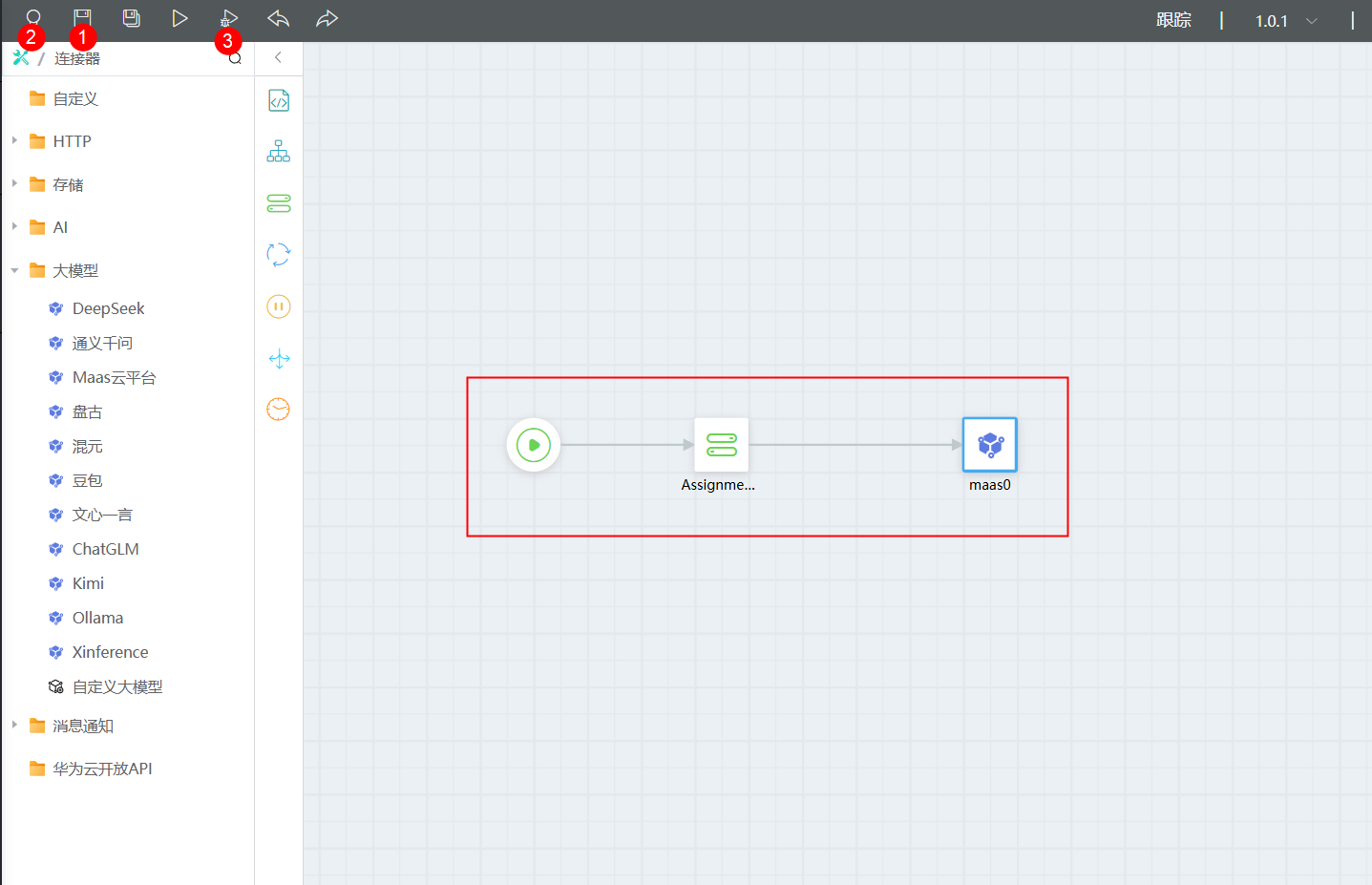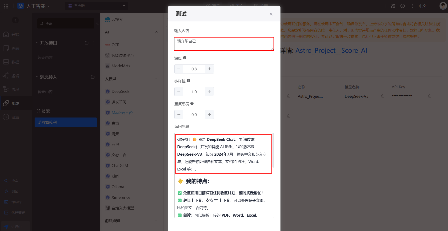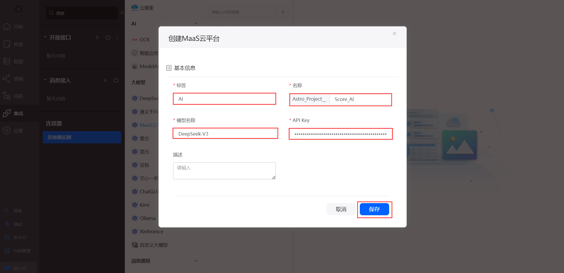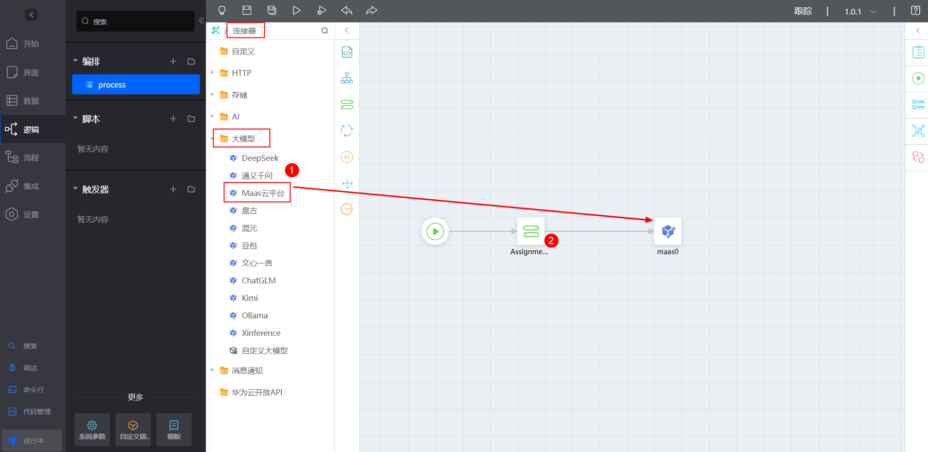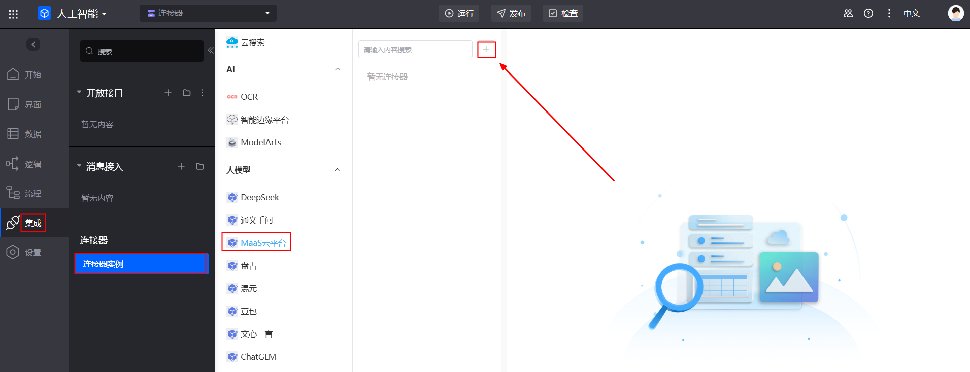 点击集成->连接器实例->MaaS云平台,点击**“+”**添加大模型: