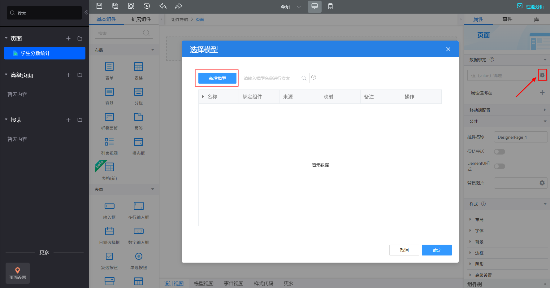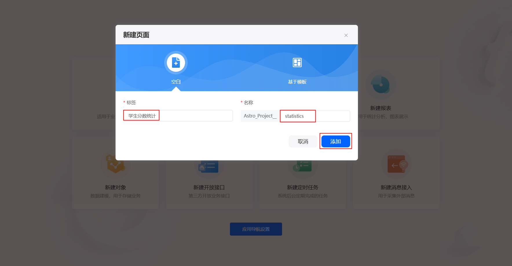 点击新建页面,弹窗中输入标签:学生分数统计,名称:statistics: