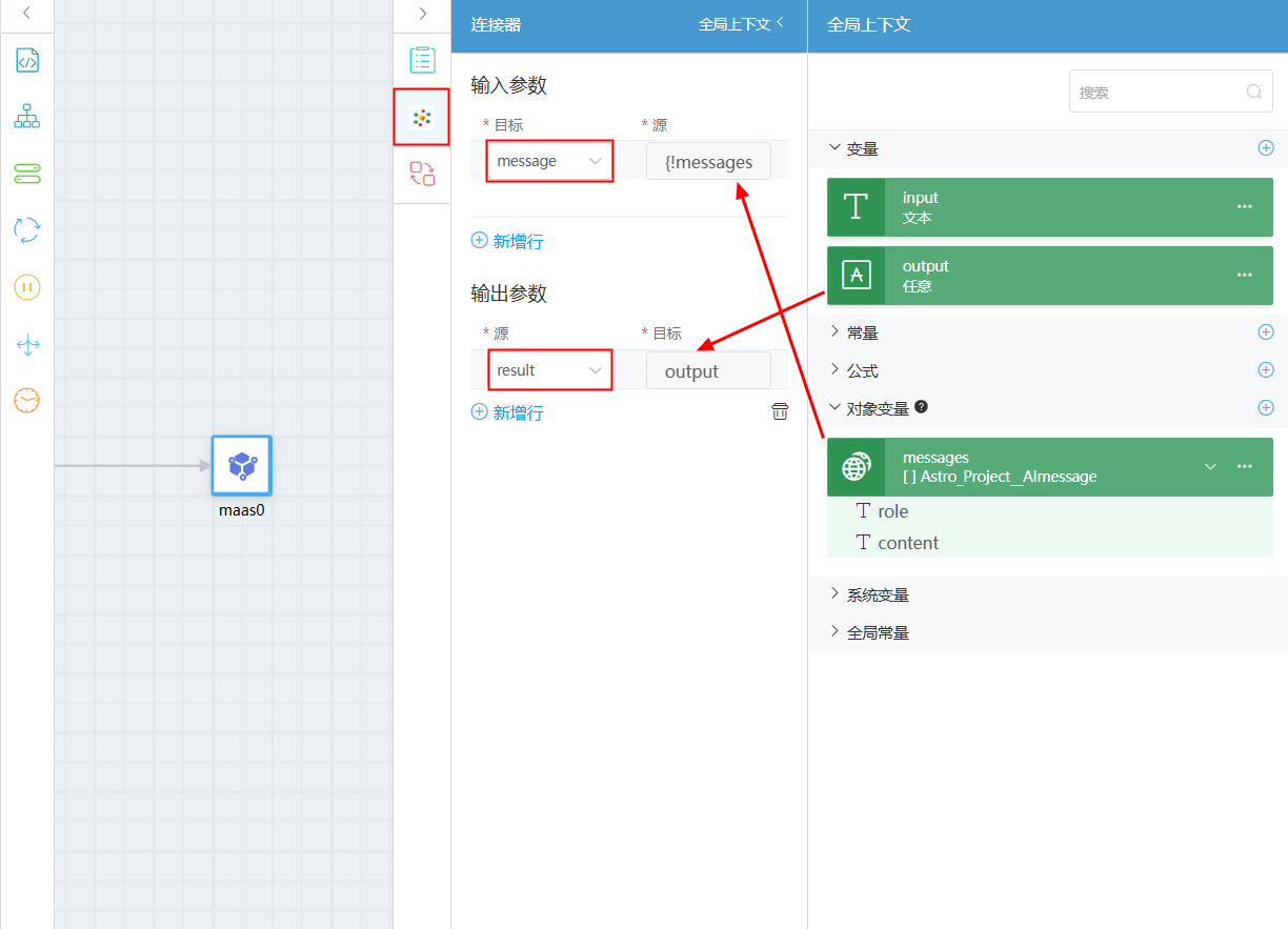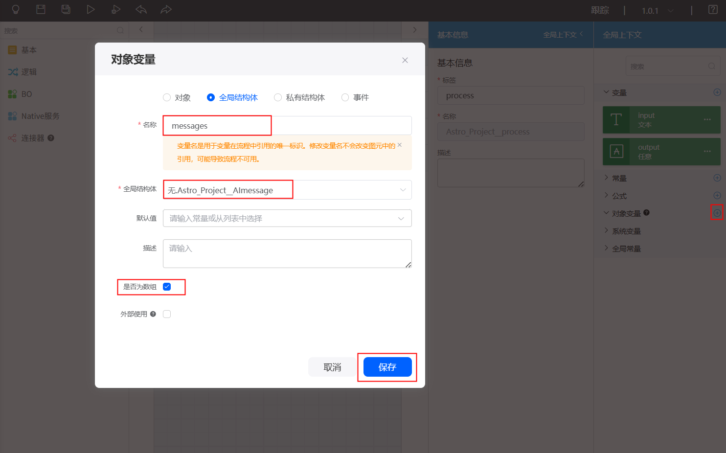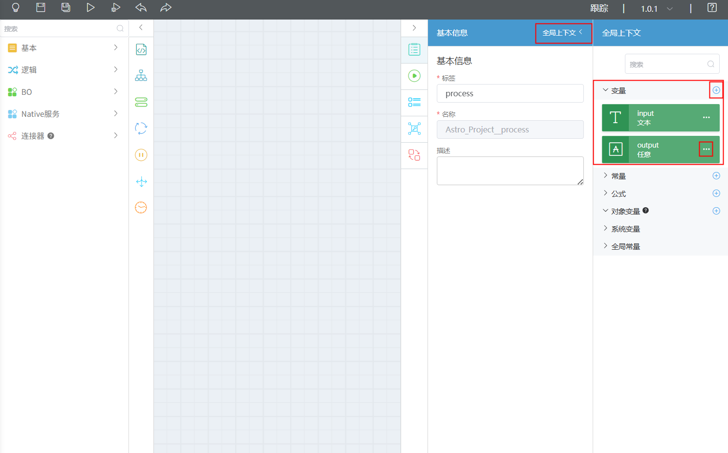 点击全局上下文->变量旁边的“+”,配置输入输出变量。