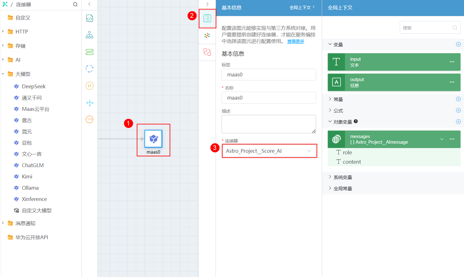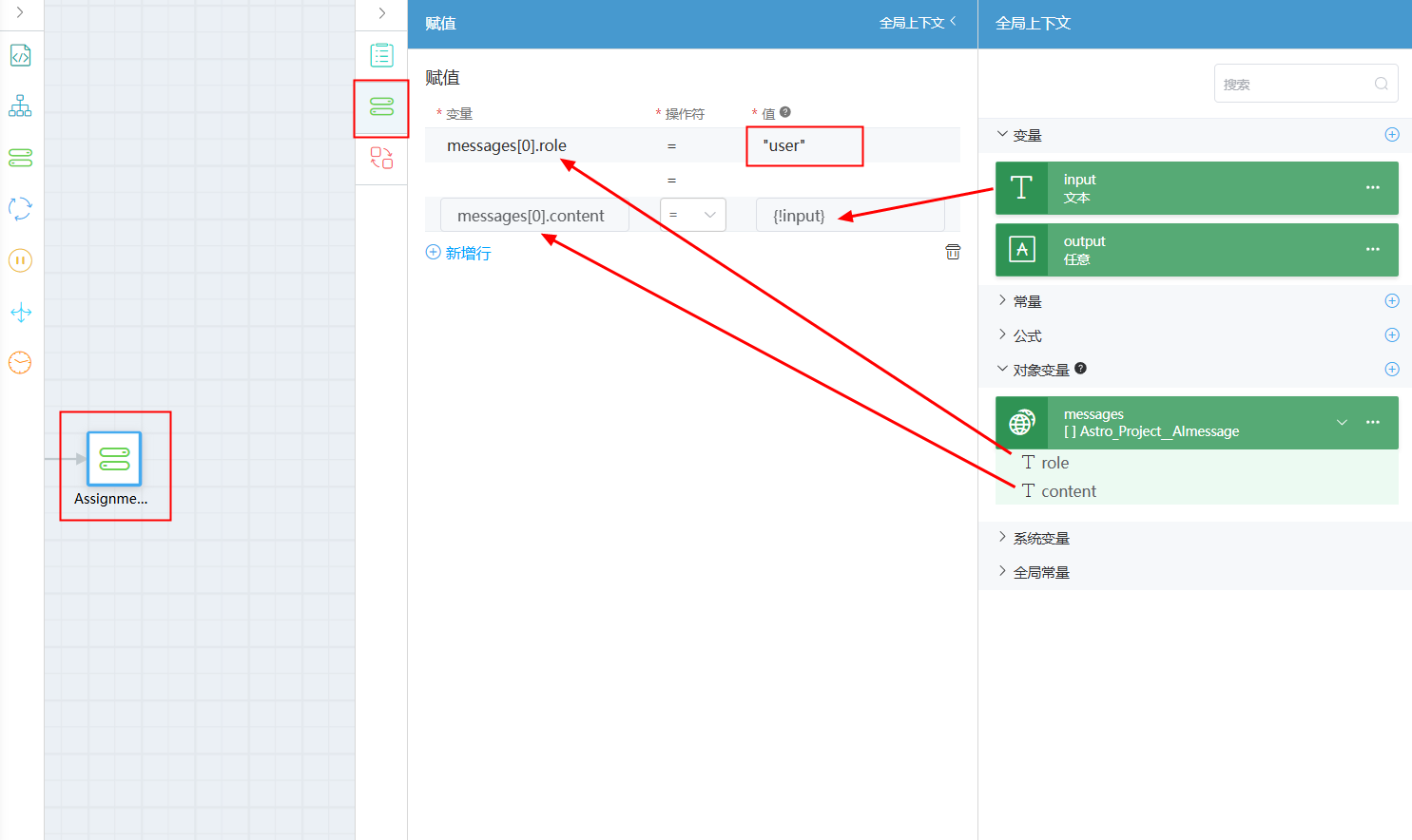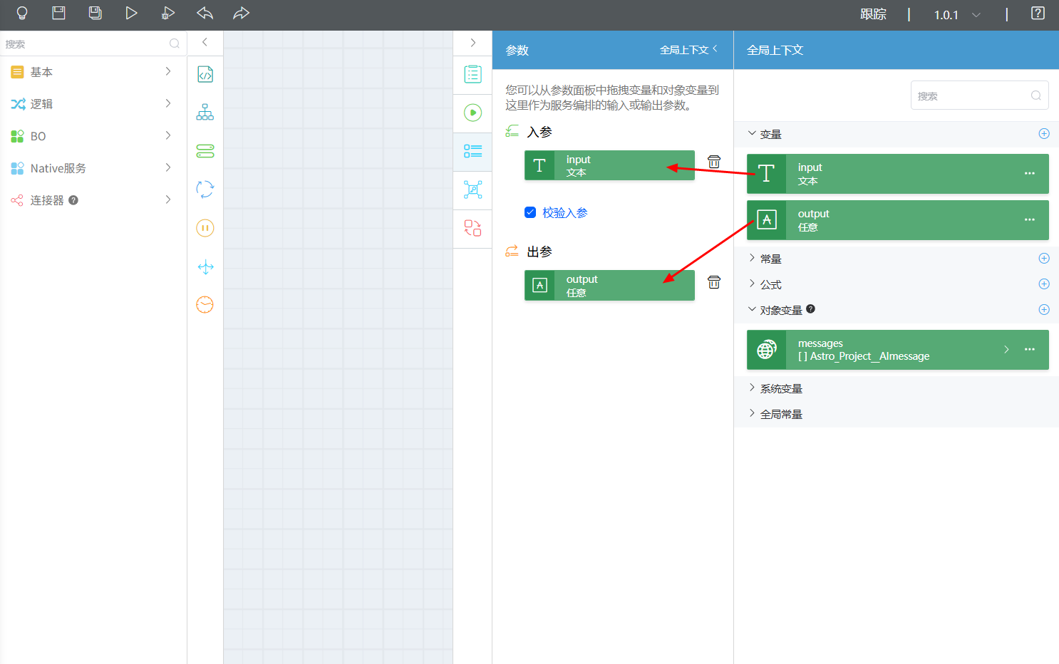 点击全局上下文->变量旁边的“+”,配置输入输出变量。