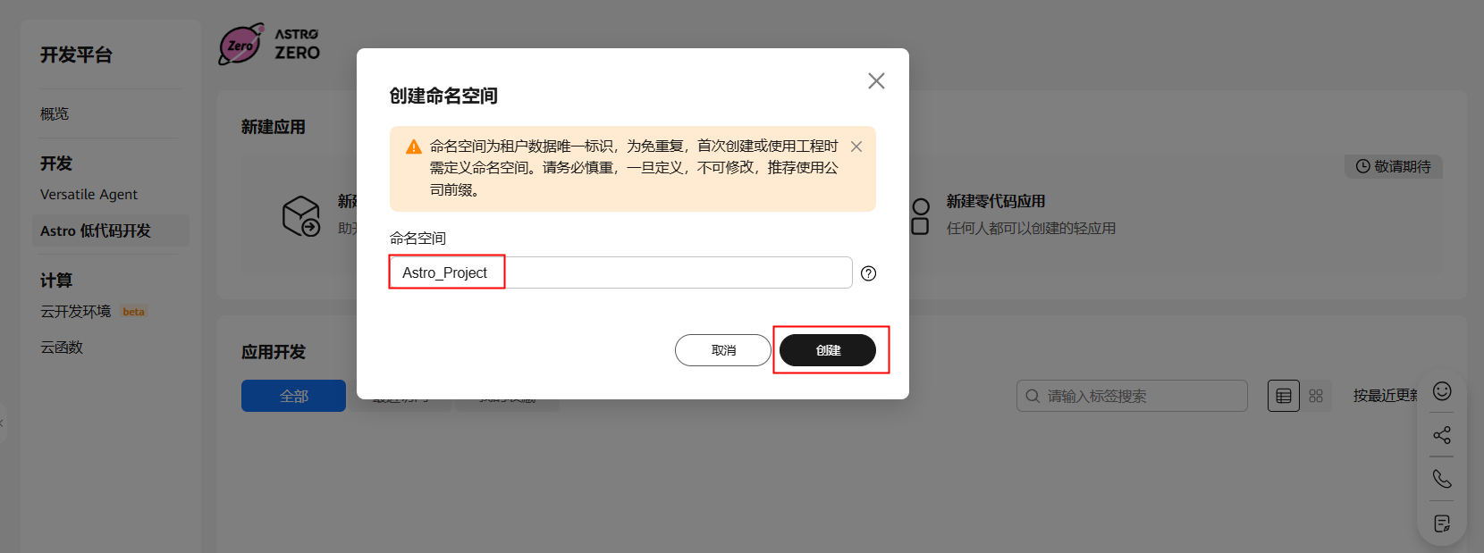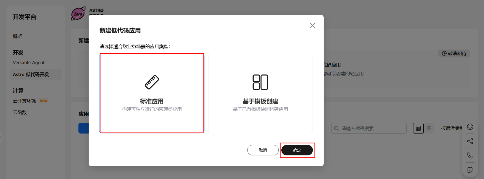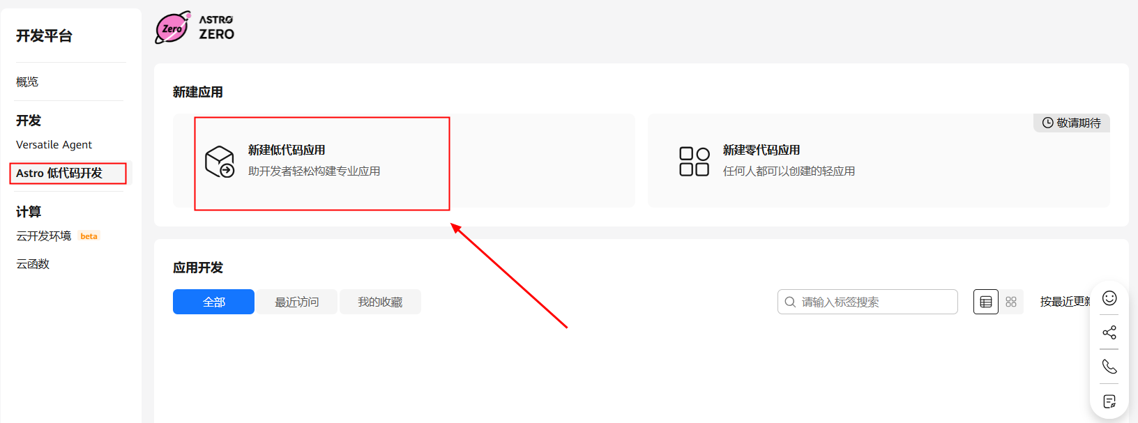 - 新建低代码应用,进入Astro轻应用服务控制台主页,开发应用。