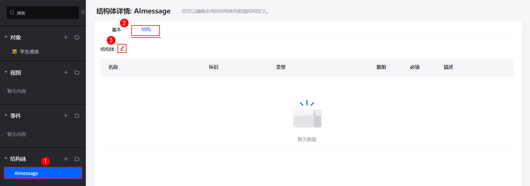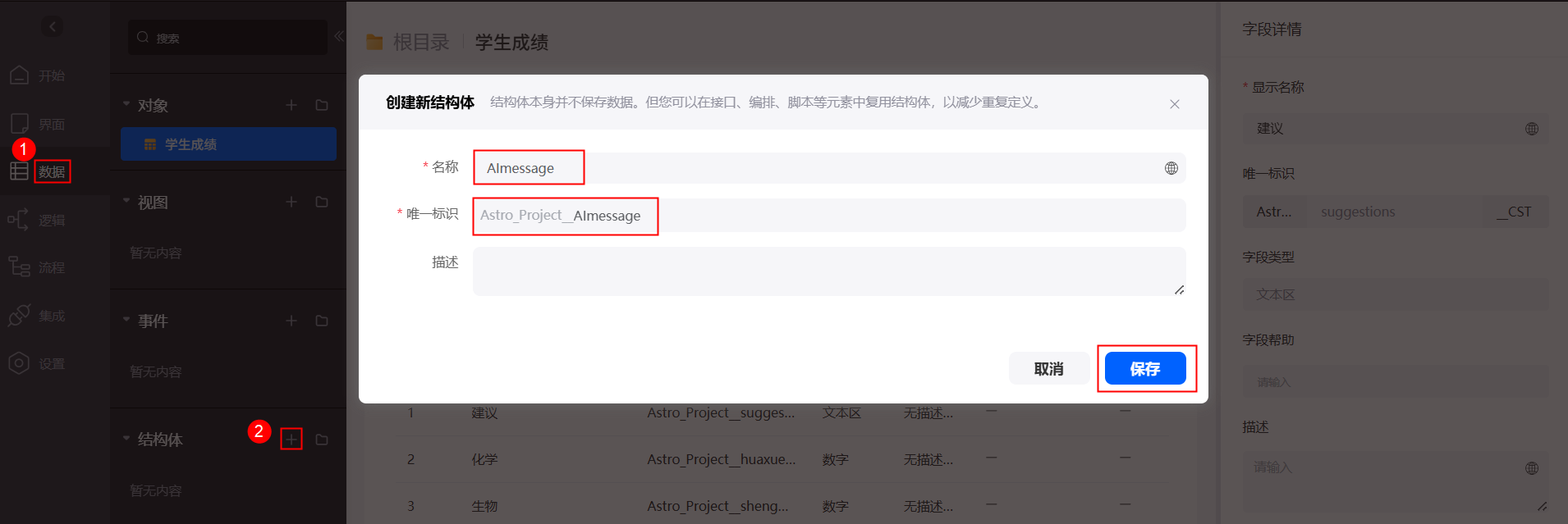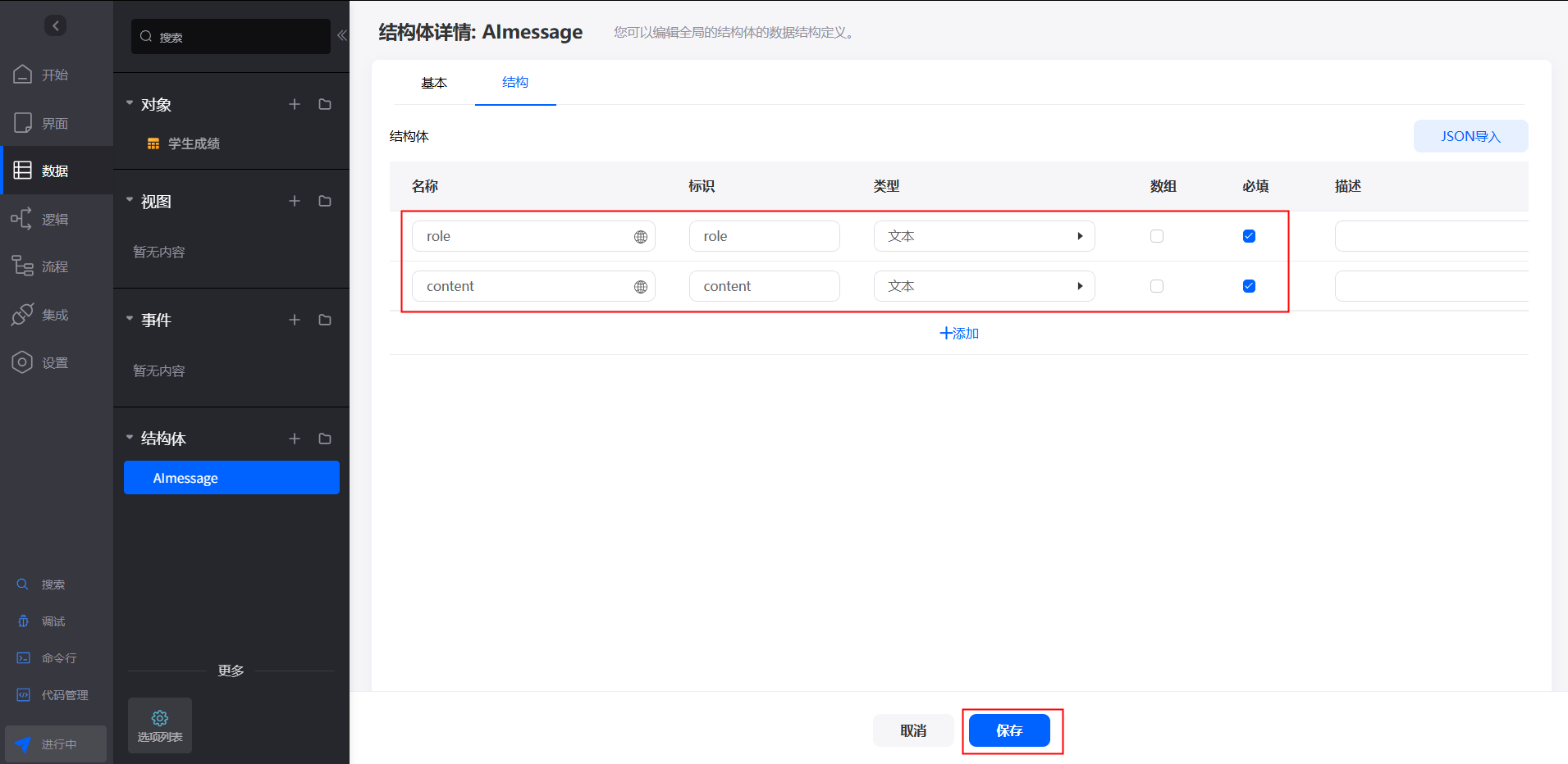 点击数据->结构体旁边的**“+”**,创建结构体:AImessage