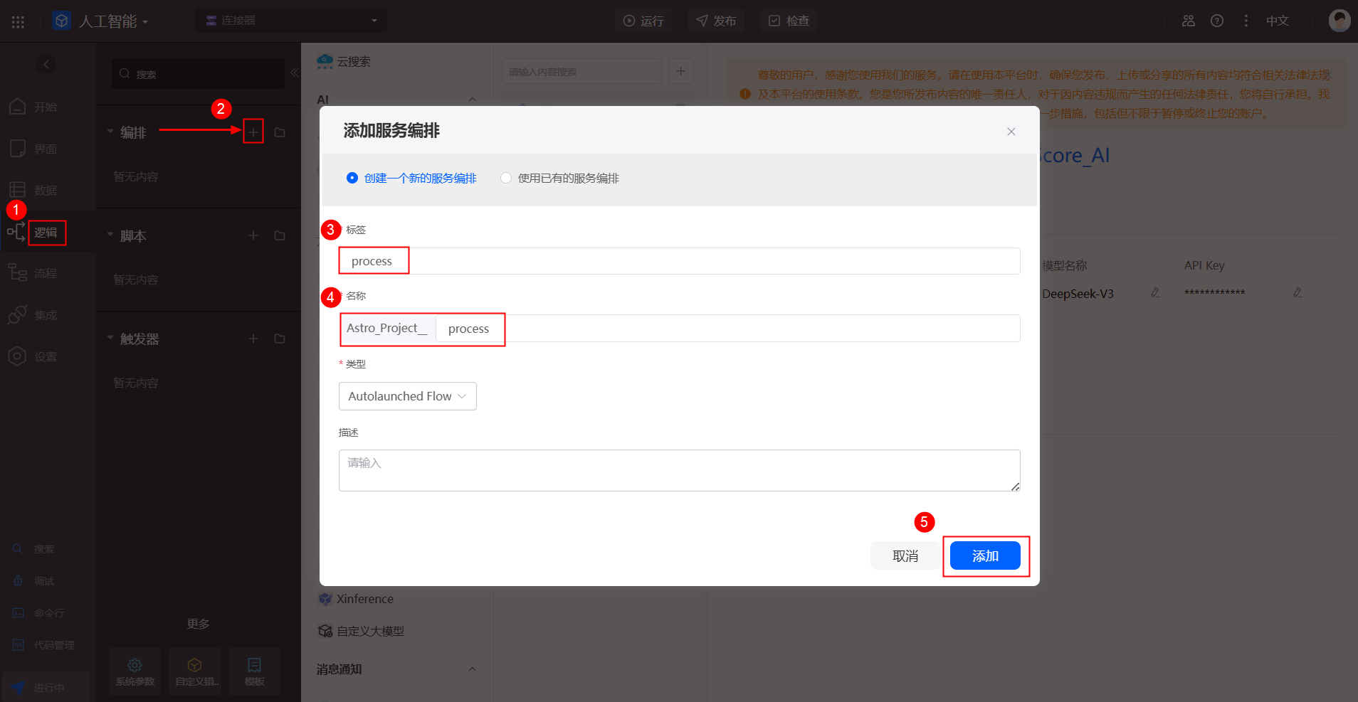 点击逻辑->编排旁边的**“+”**,添加编排服务,标签为process