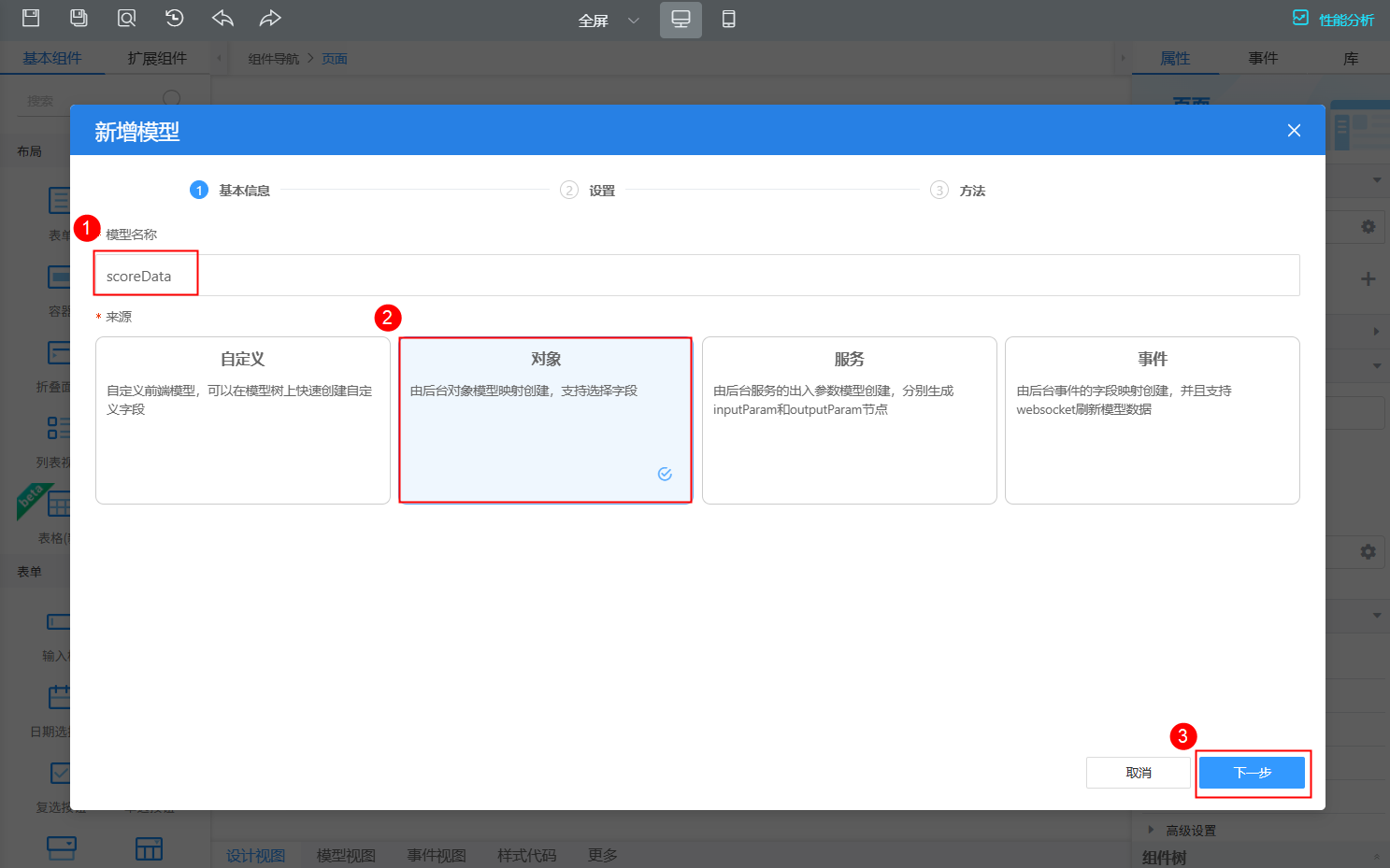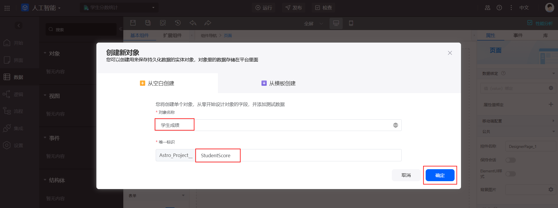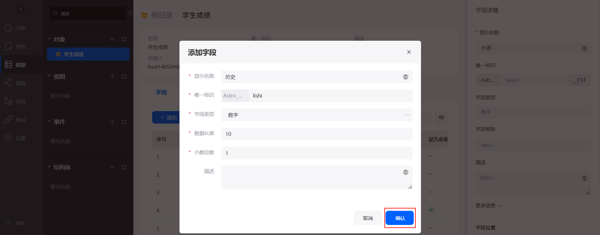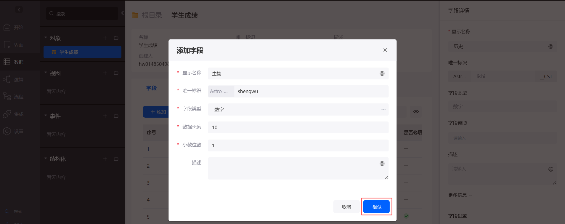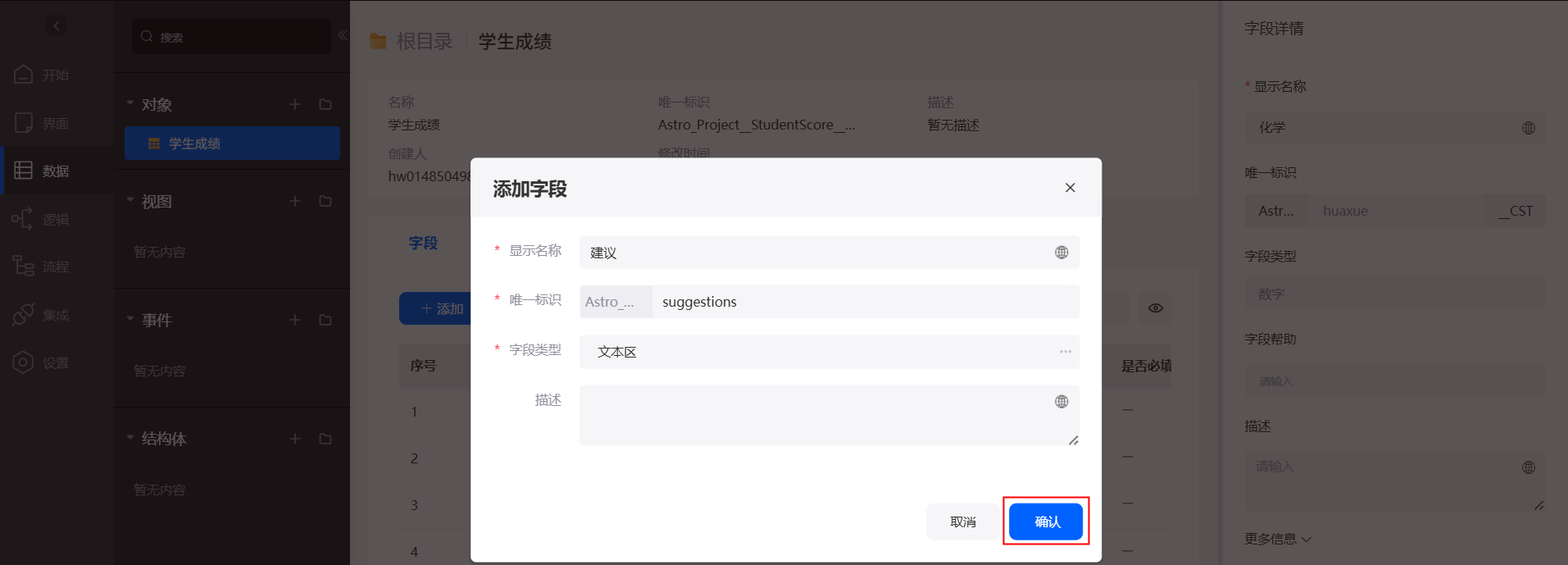 输入对象名称:学生成绩,唯一标识:StudentScore