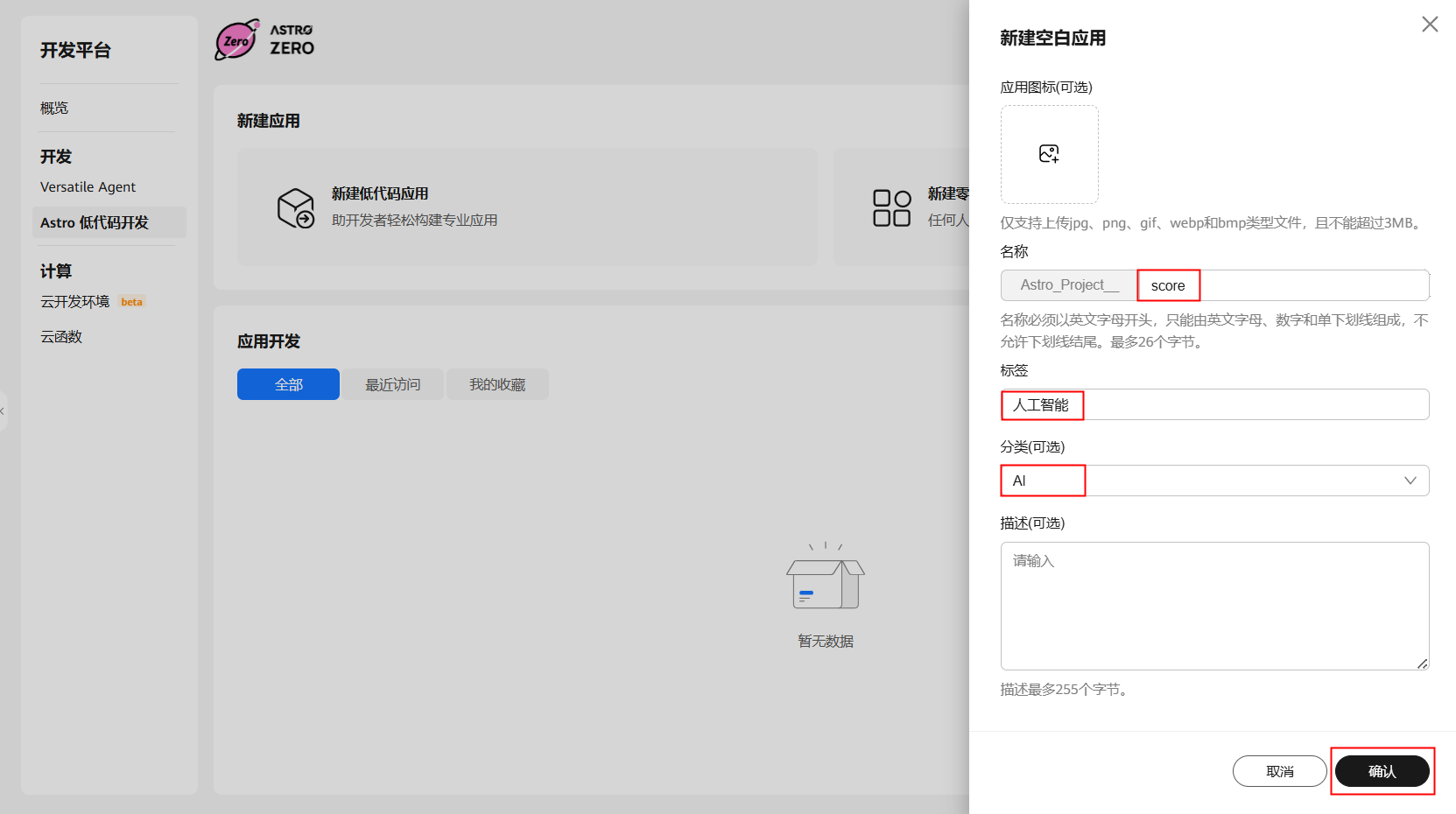 输入应用名称:score,标签:人工智能,分类:AI,点击确认按钮。