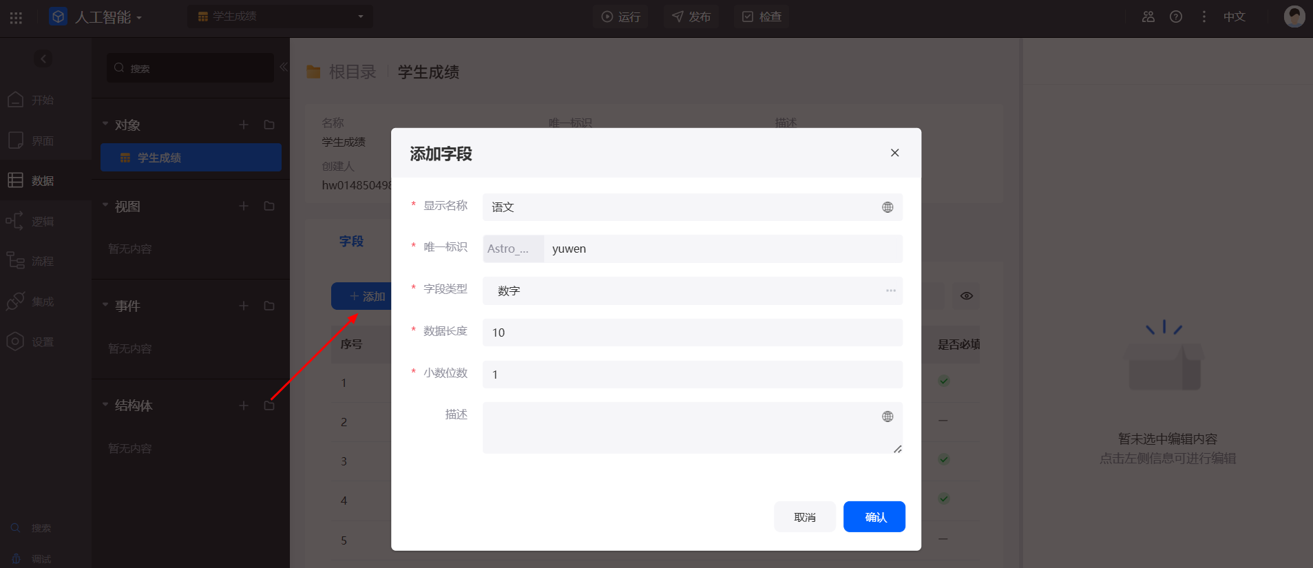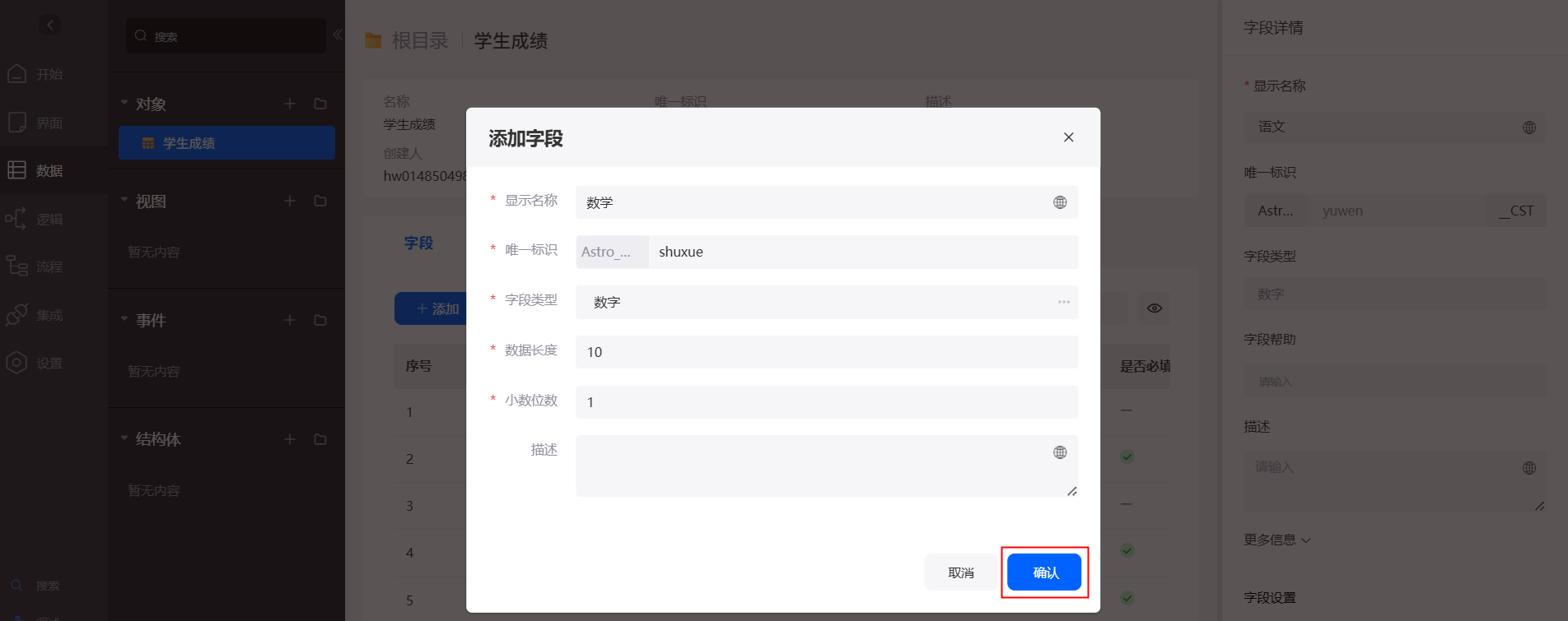 显示名称:语文,唯一标识:yuwen,字段类型:数字,数据长度:10,小数位数:1
