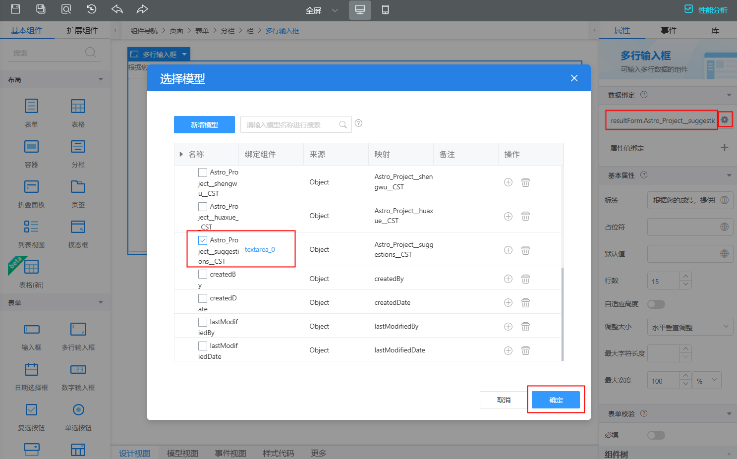 多行输入框数据绑定,绑定Astro_Project_suggestions_CST字段。