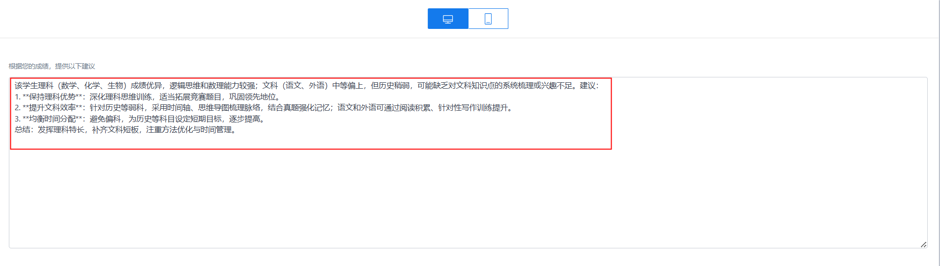 请根据以上成绩情况分析该学生的学习特点,并给出针对性的学习建议,200字以内。`.replace(/"/g, "'");