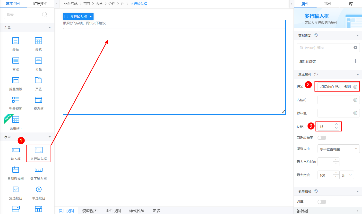 拖入多行输入框,标签:根据您的成绩,提供以下建议,行数:15行。