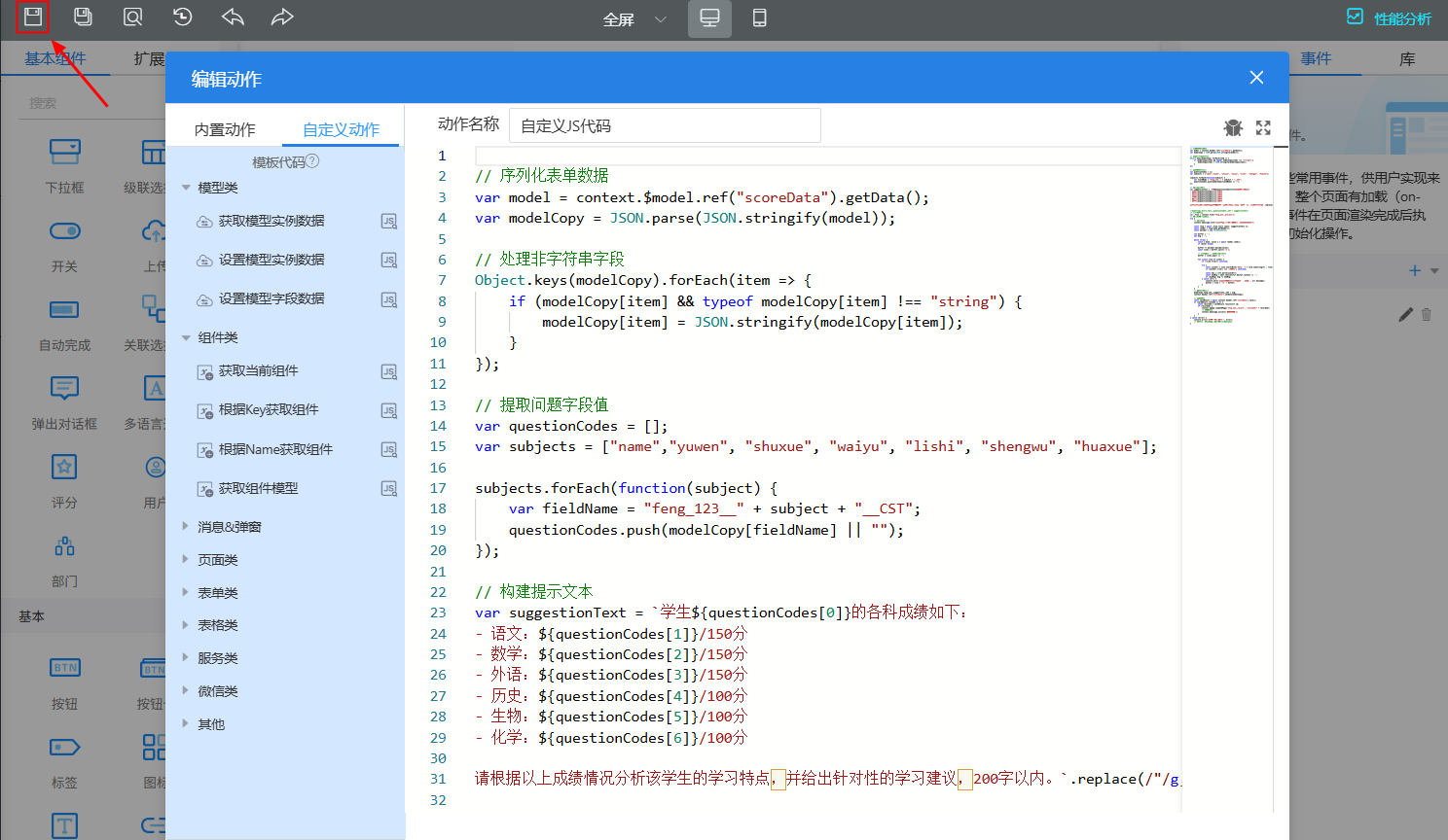 JS代码需要自行编写,可参考下面,该代码包含json数据处理,大模型提示词生成,新界面调用等。