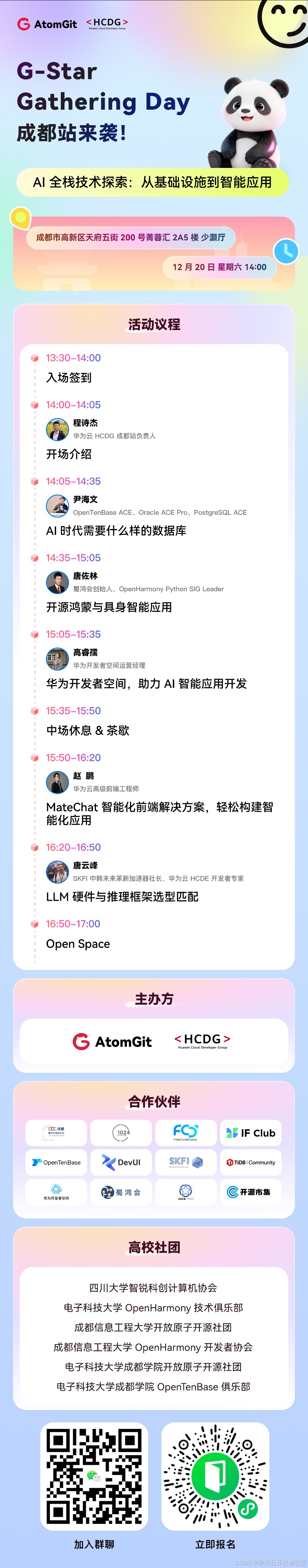 本次活动由 AtomGit 及华为云开发者联盟 HCDG 主办,聚焦 “AI 全栈技术探索:从基础设施到智能应用”,集结了数据库专家、开源社区领袖、华为云资深工程师,带你从 LLM 硬件选型、数据库演进、鸿蒙具身智能到前端智能化解决方案,进行一次全方位的技术穿透!
