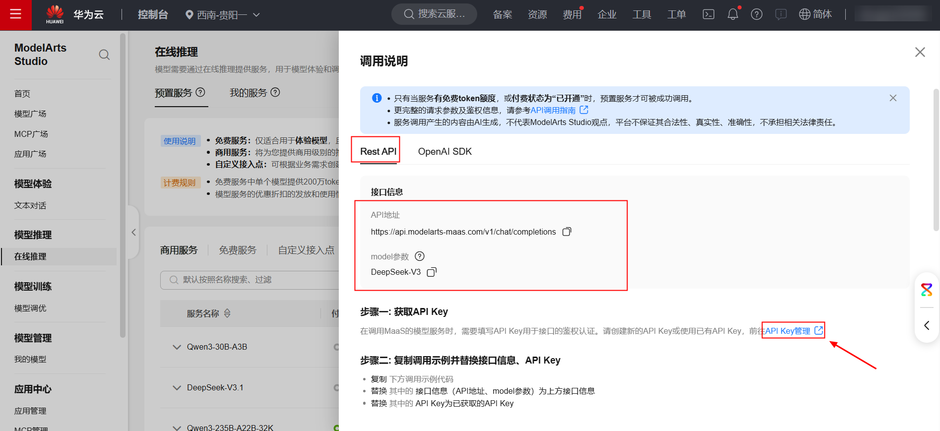参考案例《华为云MaaS大模型服务百万商用Tokens领取使用指导》中的“一、 领取”章节内容,领取华为开发者空间百万token代金券福利,购买ModelArts Studio DeepSeek-V3 轻量体验包(¥3.50)。开通商用模型服务,最后获取模型名称、API地址和API Key的参数值。