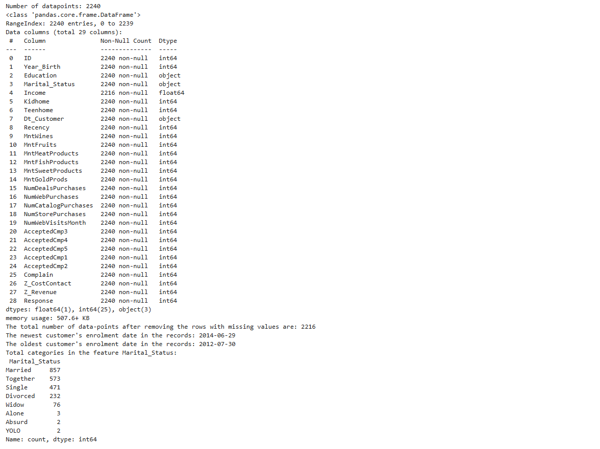 cols_del = ['AcceptedCmp3', 'AcceptedCmp4', 'AcceptedCmp5', 'AcceptedCmp1','AcceptedCmp2', 'Complain', 'Response']