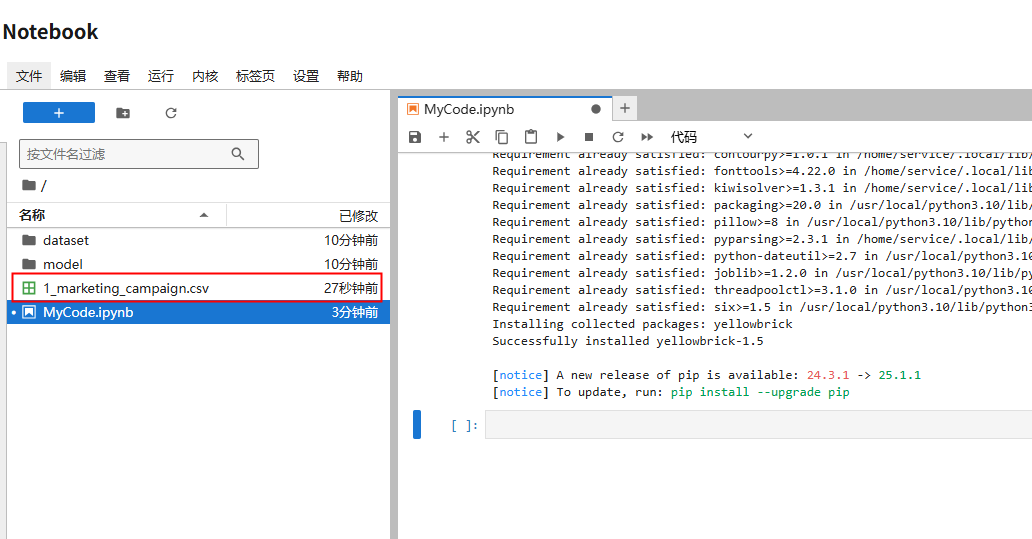 将文件拖拽到Notebook左侧代码同级目录下,数据上传成功如下图所示: