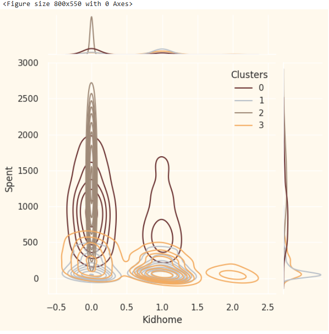 sns.jointplot(x=data[i], y=data["Spent"], hue =data["Clusters"], kind="kde", palette=pal)