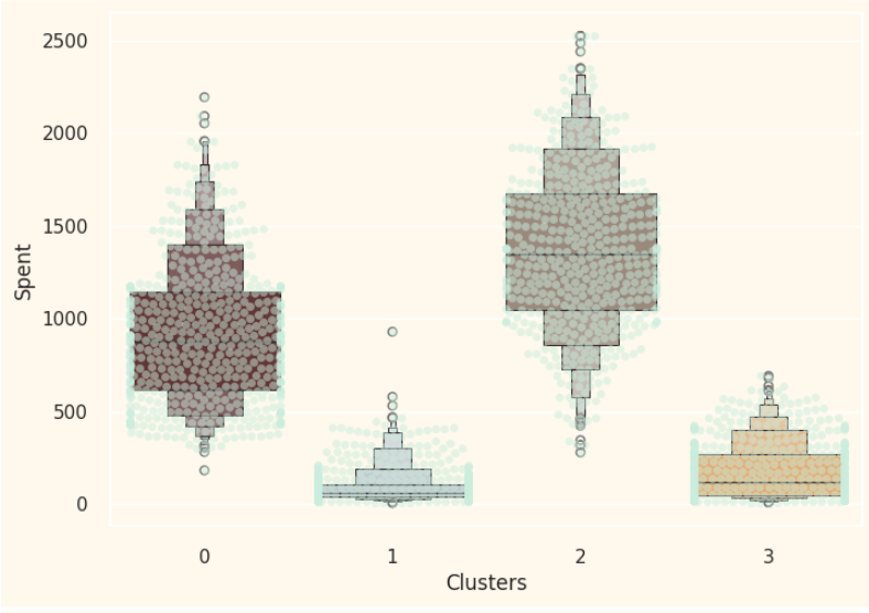 pl=sns.boxenplot(x=data["Clusters"], y=data["Spent"], palette=pal)