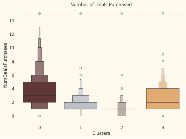 pl=sns.boxenplot(y=data["NumDealsPurchases"],x=data["Clusters"], palette= pal)