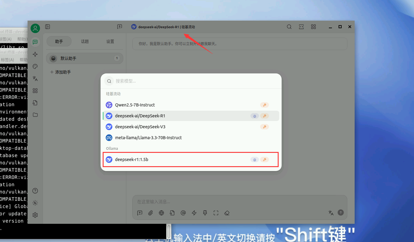 回到 Cherry Studio 主页面,在界面上方选择我们本次通过 ollama服务 部署的 deepseek-r1:1.5b 模型。