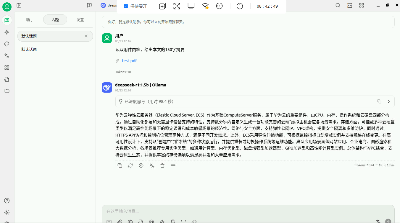 可以看到,文件内容被 DeepSeek 精准解析,并成功返回约150字的全文摘要。