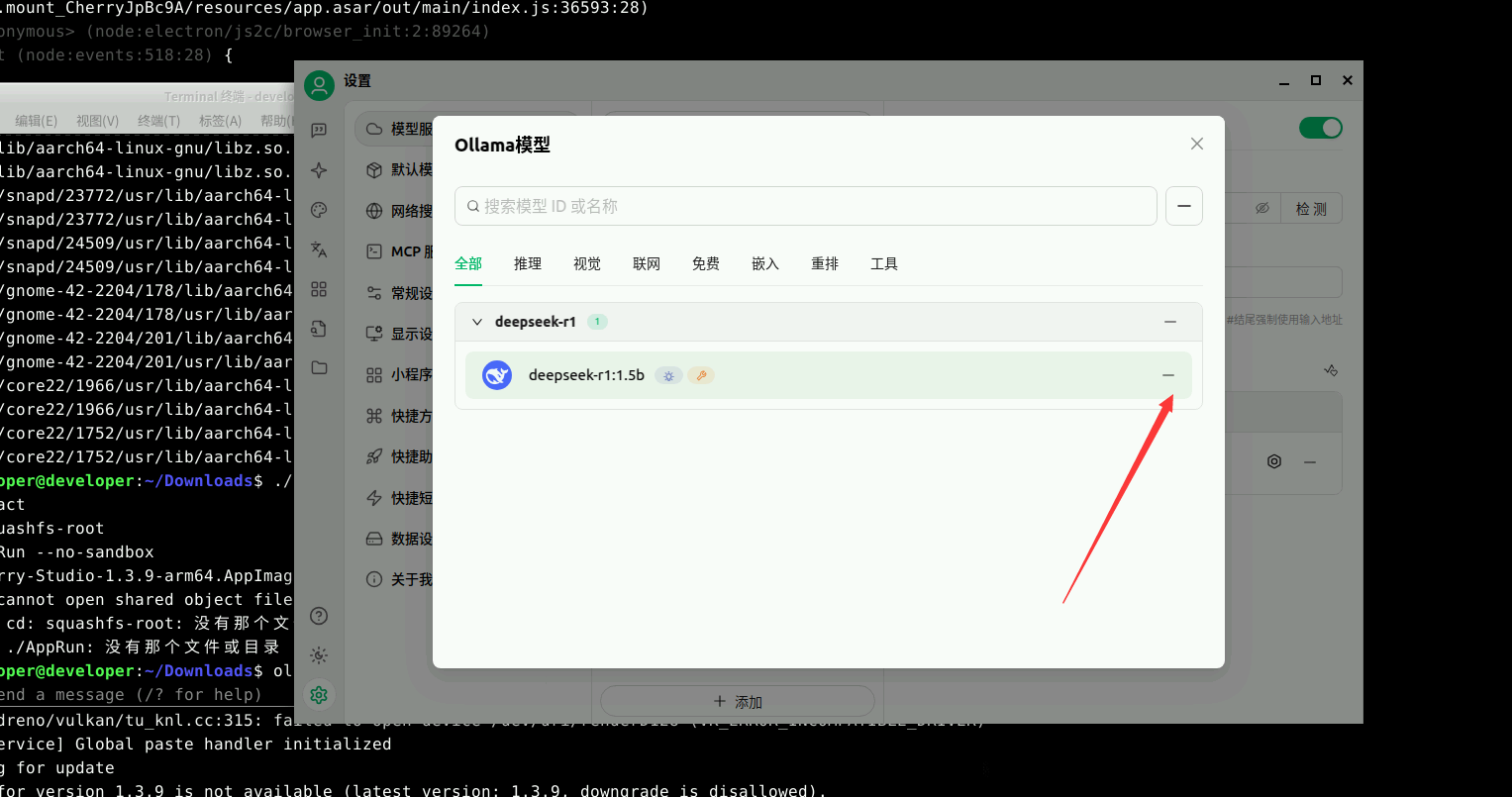 点击加号按钮,将 deepseek-r1:1.5b 添加到模型服务里。