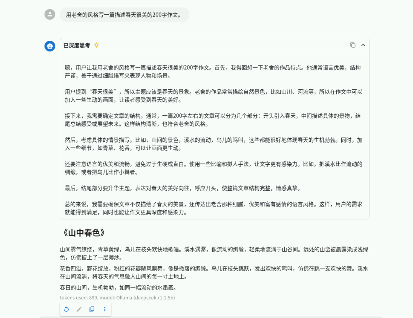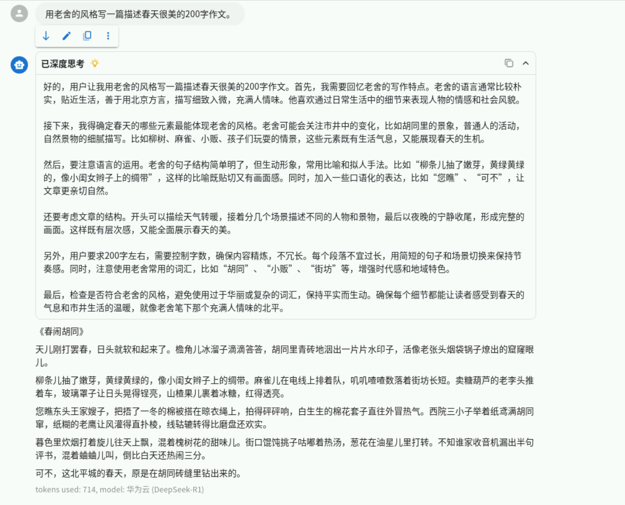 点击新会话,右下角切换模型为华为云的DeepSeek-R1,prompt依然使用:用老舍的风格写一篇描述春天很美的200字作文。