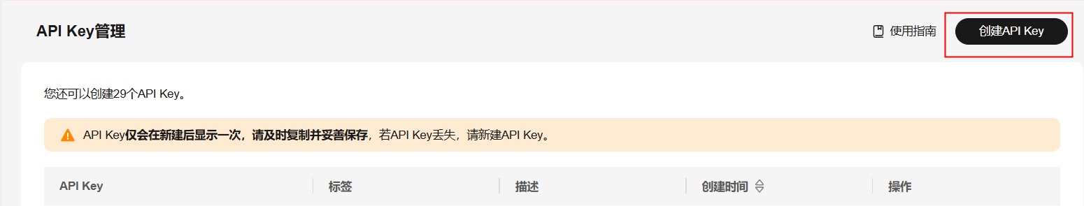 点击【API Key管理】进入创建API Key页面,点击右上角【创建API Key】,自定义标签和描述,点击【确定】创建API Key。