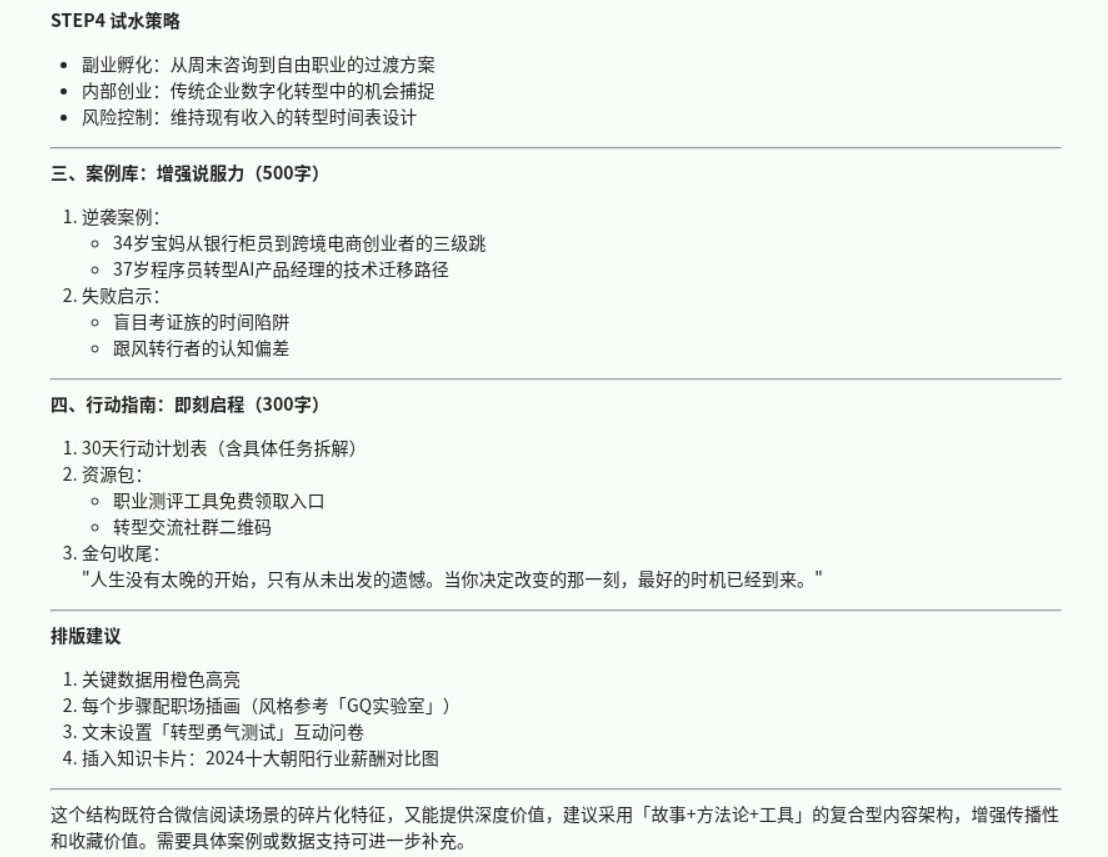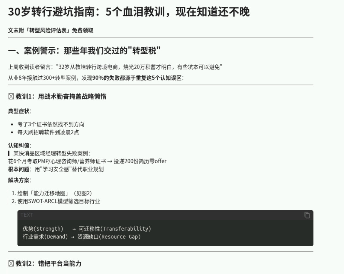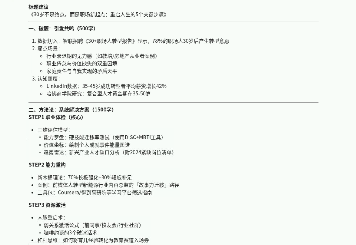 prompt:我想基于"30岁后如何重启职业生涯",写⼀篇微信公众号文章,规划一下写作思路。