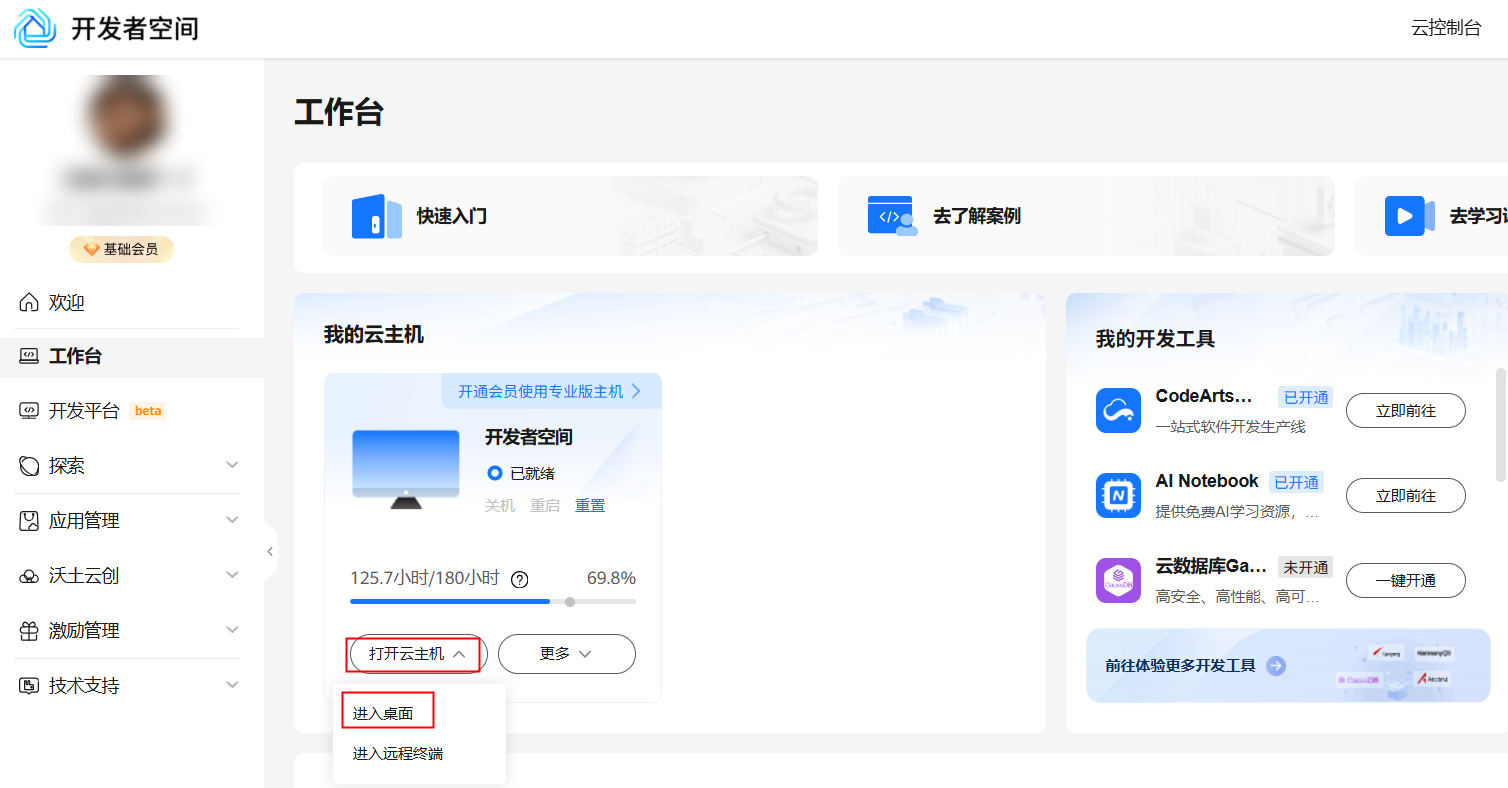 领取云主机后可以直接进入华为开发者空间工作台界面,点击打开云主机 > 进入桌面连接云主机。