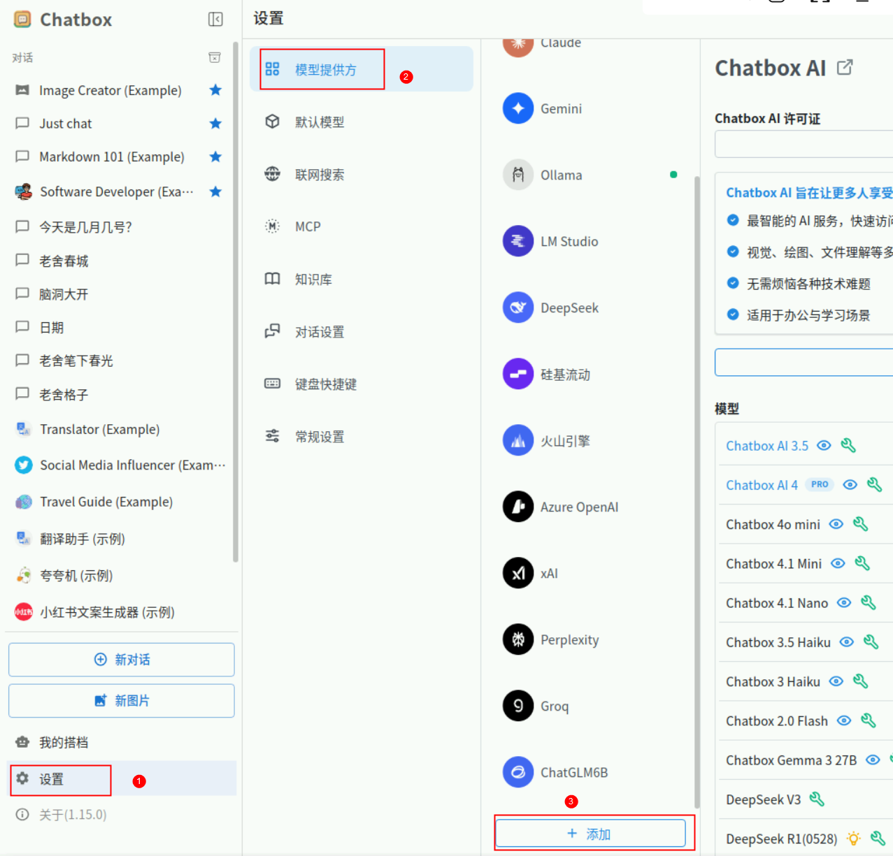 回到ChatBox主界面,点击设置,选择模型提供方,然后最下面找到添加按钮。