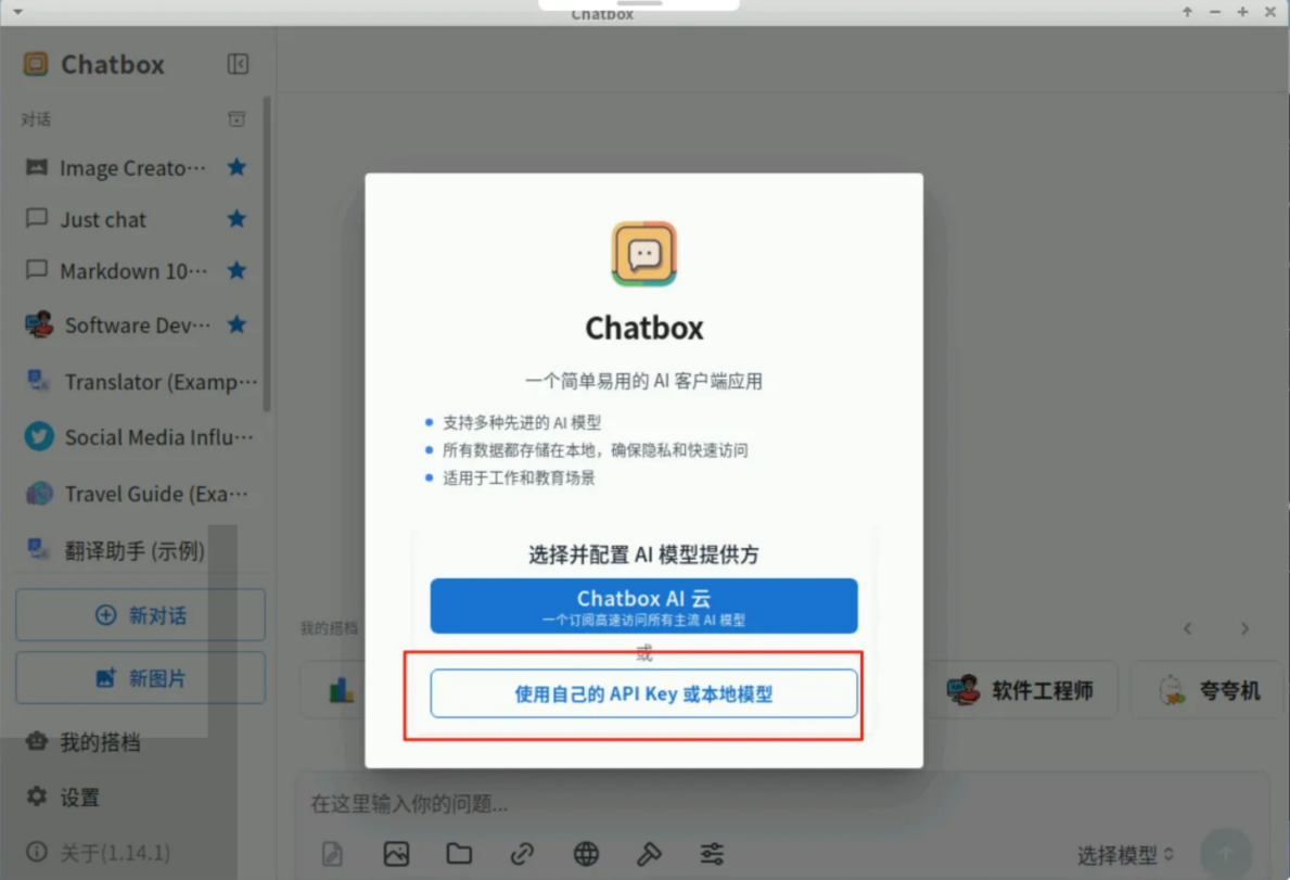 选择使用自己的API Key或本地模型: