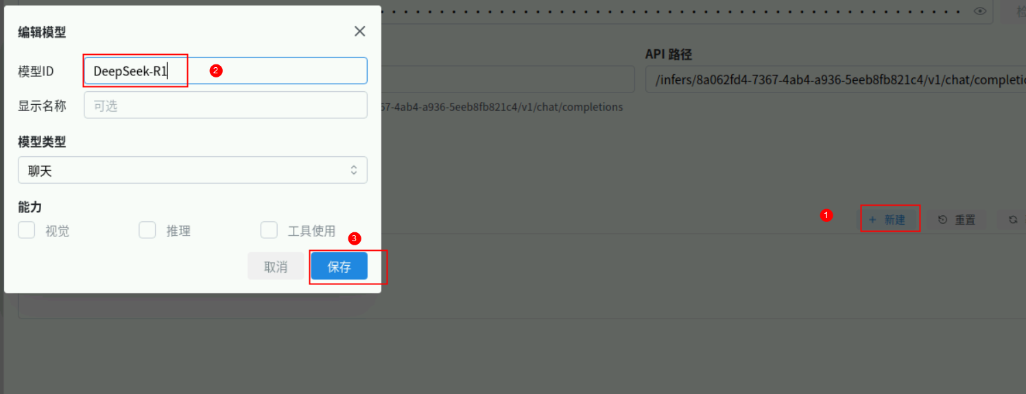 点击模型的新建按钮,输入DeepSeek-R1,点击保存即可。