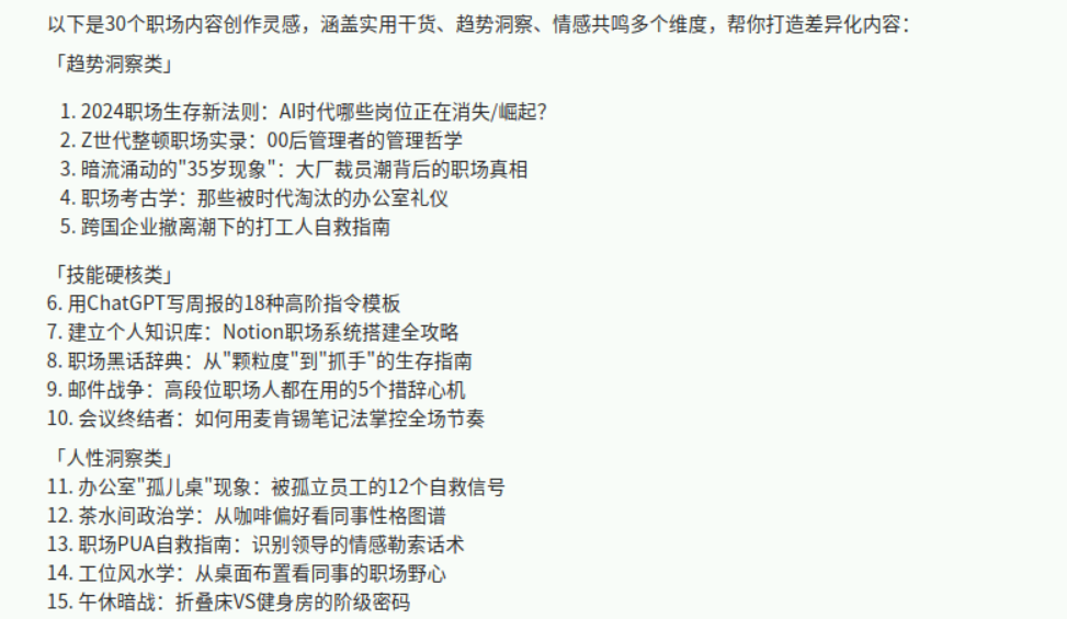 - 假设,我是一名职场自媒体博主,我每周更新3篇文章,但高强度的创作加上繁忙的工作,让我没有充足的时间来构思文章思路。我们借助DeepSeek来搜集创意,形成自己的创意集。